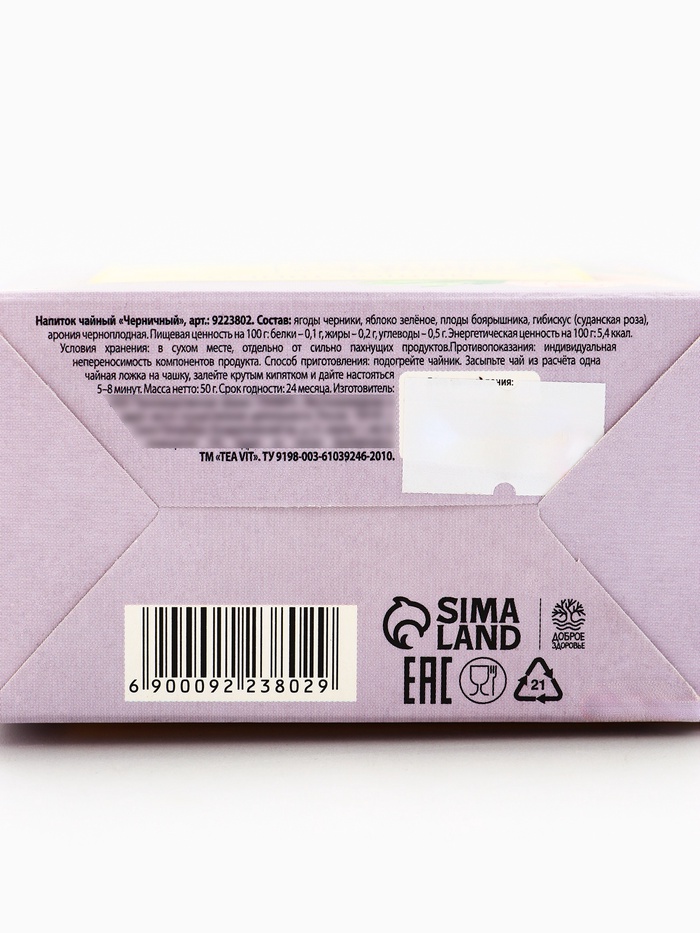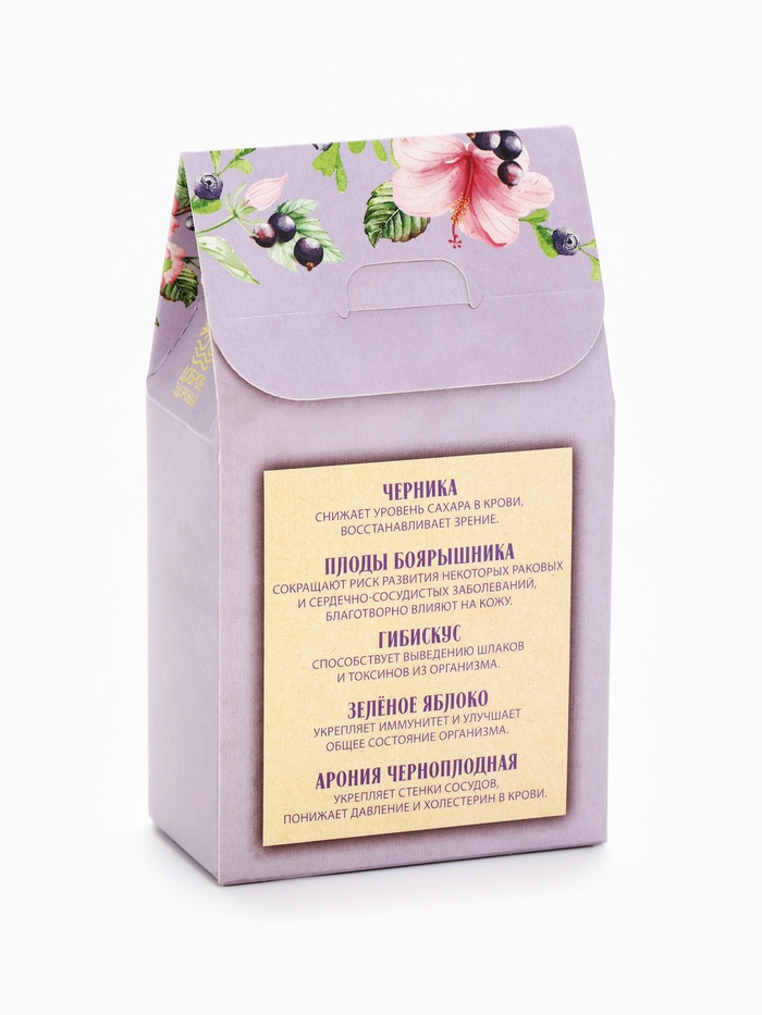 Состав: ягоды черники, зелёное яблоко, плоды боярышника, гибискус (суданская роза), арония черноплодная.
