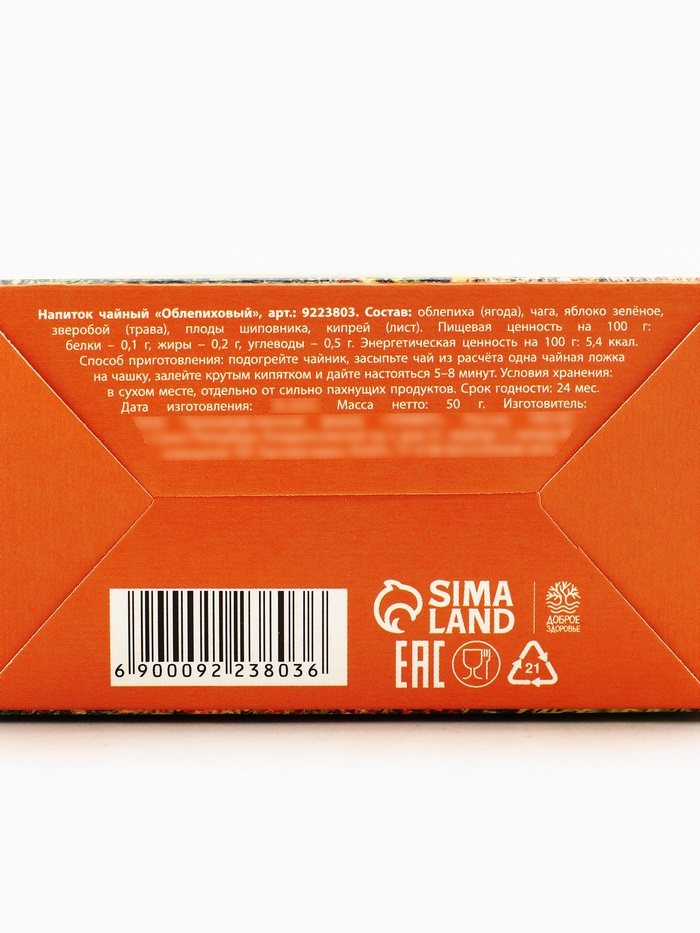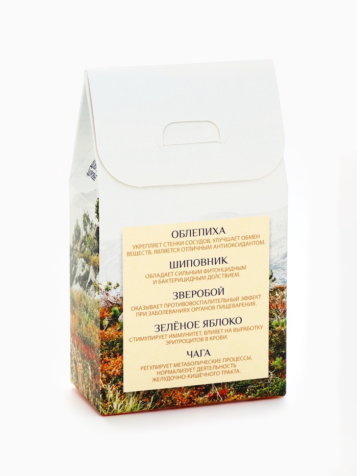 Состав: облепиха (ягода), чага, яблоко зелёное, зверобой (трава), плоды шиповника, кипрей (лист).