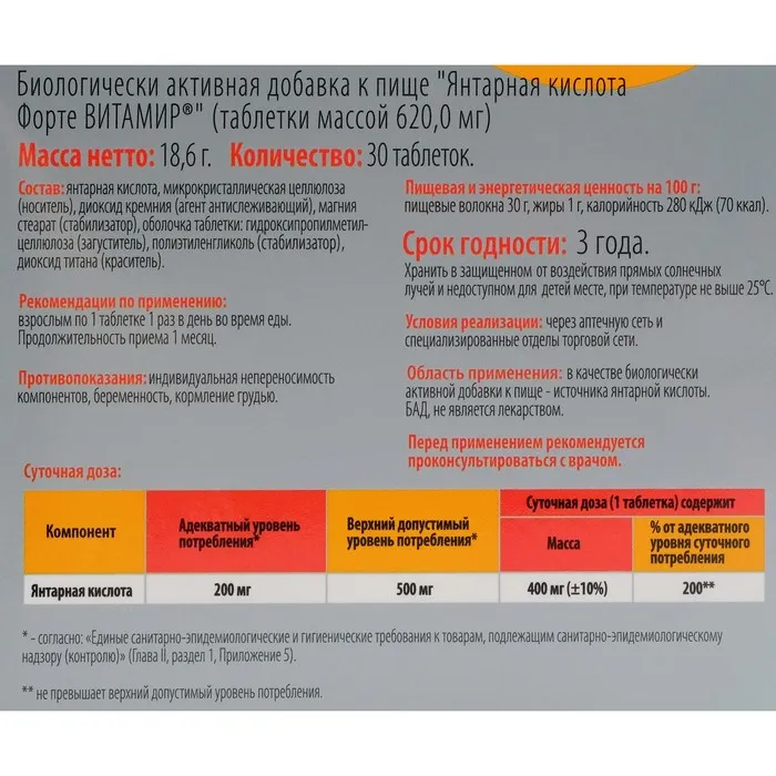 Янтарная кислота форте - это биологически активная добавка, содержащая 30 таблеток массой по 620 мг каждая. Данный препарат является источником янтарной кислоты, которая замедляет процесс старения, повышает иммунитет, улучшает метаболизм и сердечно-сосудистую деятельность, способствует выработке энергии в организме. Этот препарат рекомендуется использовать в качестве дополнительного источника биологически активных веществ для сохранения здоровья и повышения иммунитета.