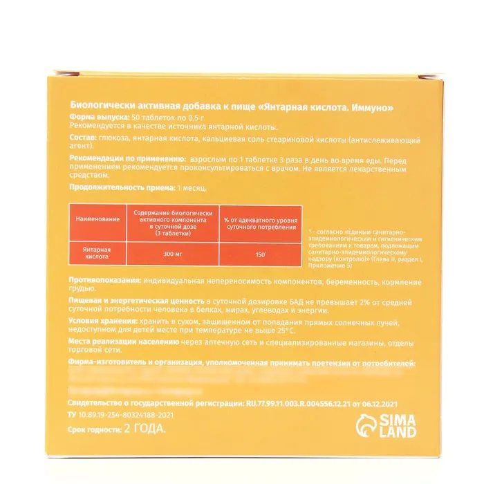 Янтарная кислота Иммуно - Биологически активная добавка (БАД) к пище- янтарная кислота - мощный антиоксидант, который замедляет процессы старения, ускоряет обменные процессы и поддерживает иммунитет