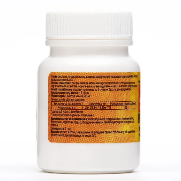Состав: янтарная кислота; вспомогательные вещества: глюкоза, крахмал картофельный, тальк, кальция стеарат.