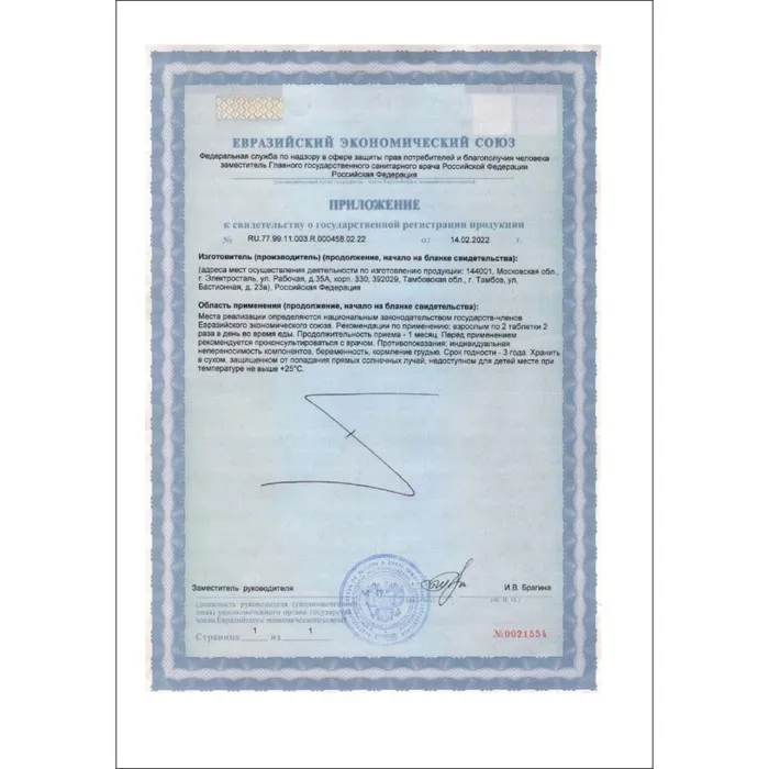Способ применения: взрослым от 18 лет выпивать по 1 таблетке 2 раза в день во время еды. Не рекомендуется употреблять одновременно с лекарственными препаратами.