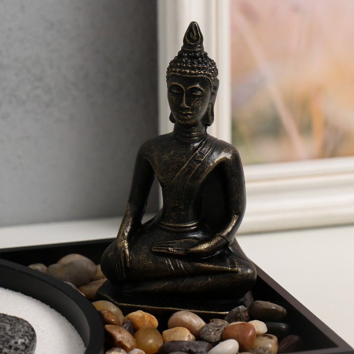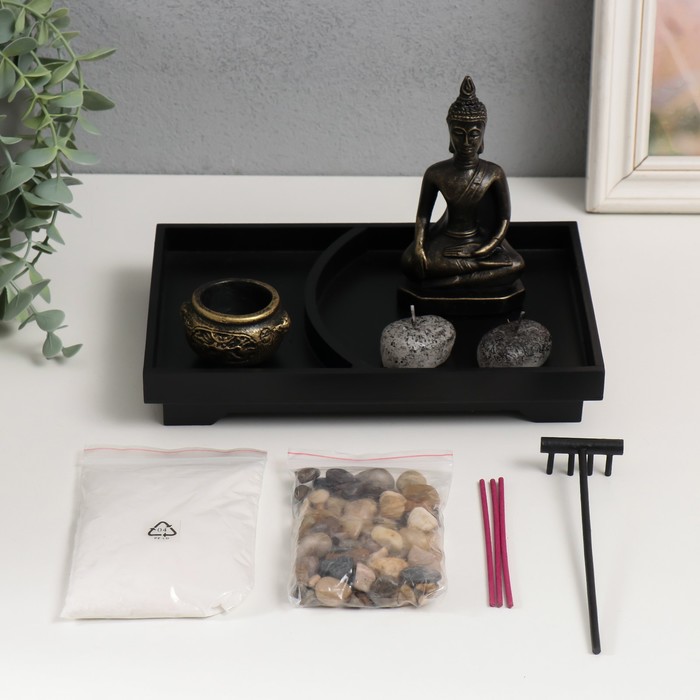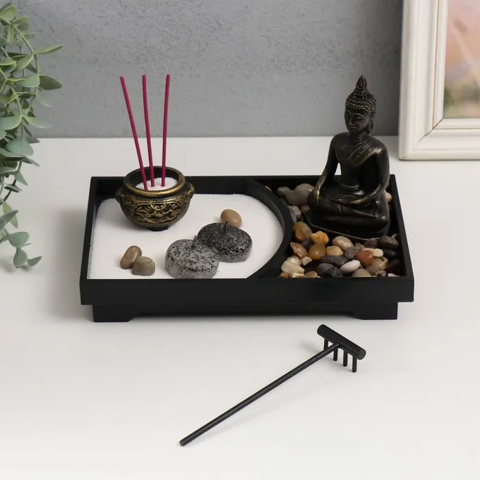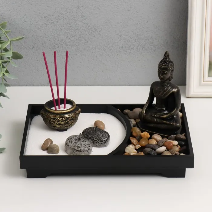 Представьте возможность создать личное пространство для спокойствия и размышлений прямо на своём рабочем столе. Этот миниатюрный сад в стиле Дзен воплощает философию гармонии, где бронзовый Будда символизирует мудрость и внутреннее равновесие.