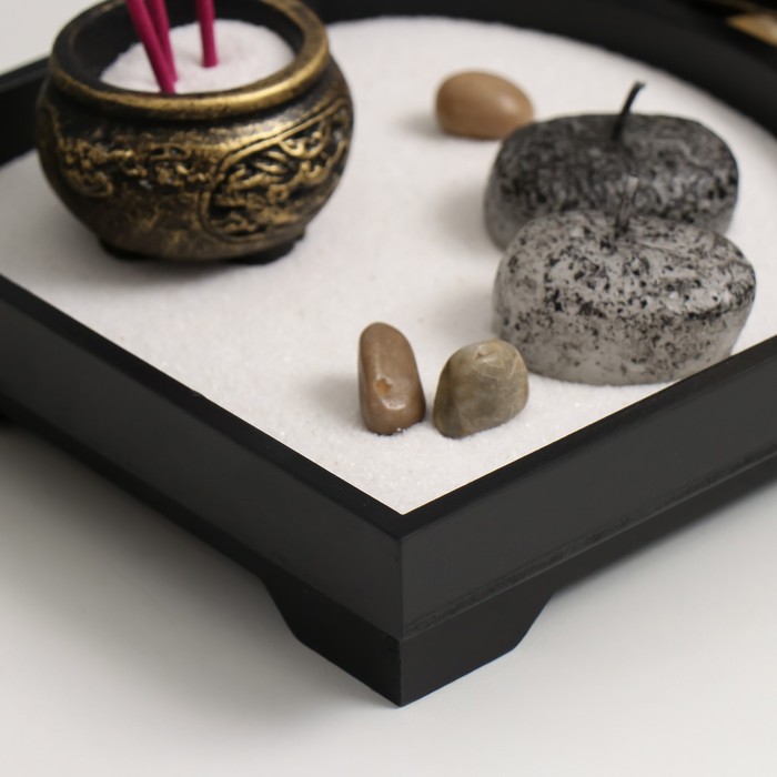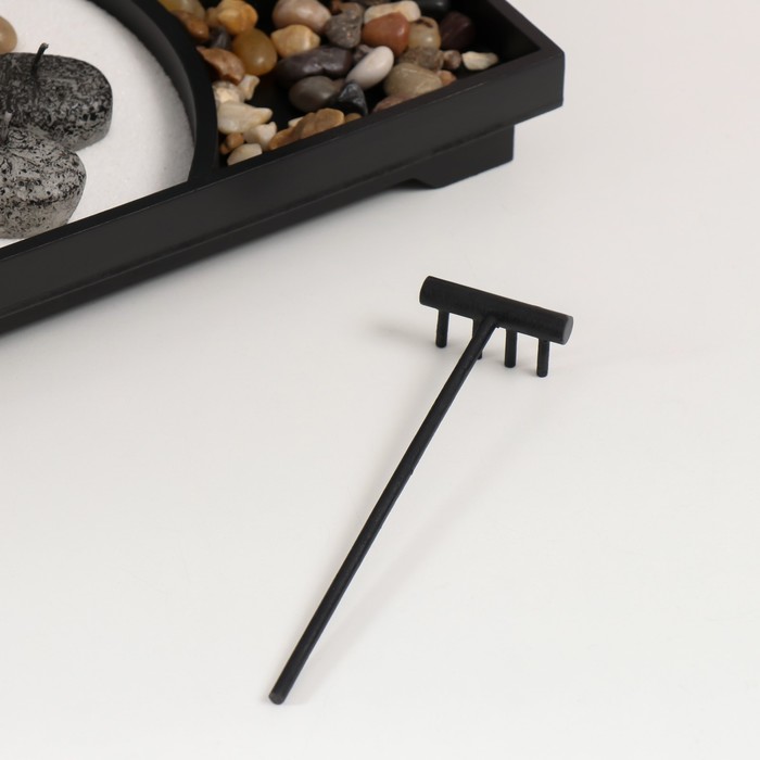 Такое решение идеально подходит для тех, кто ищет способ расслабиться и найти покой в повседневной суете. Создание узоров на песке помогает сосредоточиться и отвлечься от стресса, а сам процесс работы с композицией может стать регулярной практикой для восстановления душевного равновесия. Компактные размеры (22×15×12,5 см) позволяют легко разместить сад даже на небольшом пространстве.