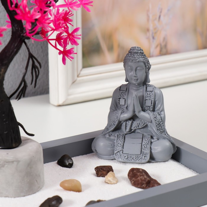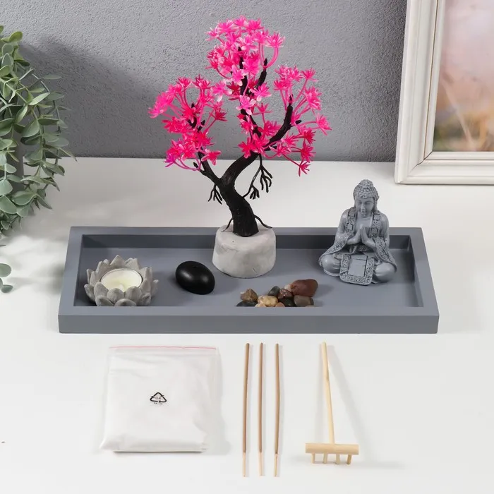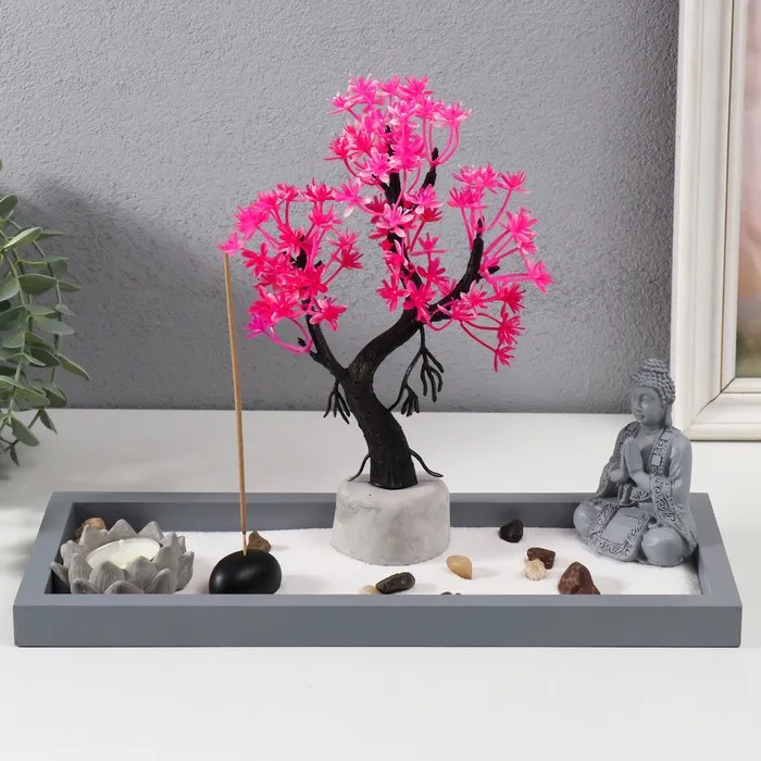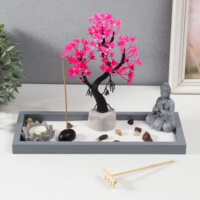 Погрузитесь в атмосферу спокойствия и гармонии с настольным садом в стиле Дзен. Эта композиция объединяет символы японской культуры: фигуру Будды, цветущую сакуру и миниатюрные элементы природы, создавая пространство для медитации и самопознания.
