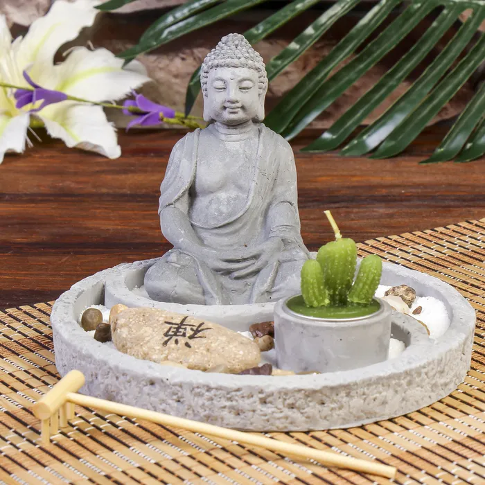 Погрузитесь в атмосферу гармонии и умиротворения с этим уникальным настольным садом камней. Этот миниатюрный уголок дзен станет не только стильным украшением вашего интерьера, но и источником вдохновения, помогая обрести внутренний баланс и сосредоточенность. Комплект включает в себя все необходимое для создания уютной медитативной атмосферы: свечу, аксессуары и фигурку Будды, выполненную в образе Мыслителя — духовного наставника.