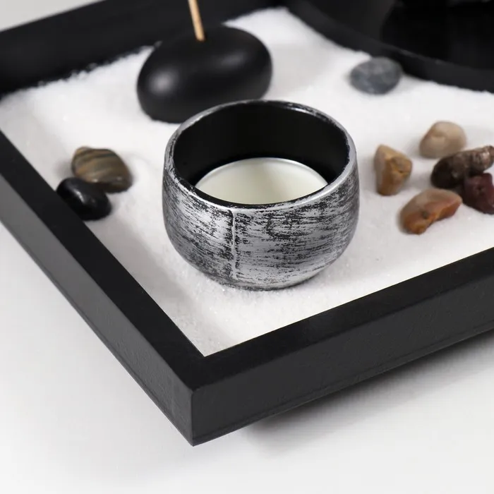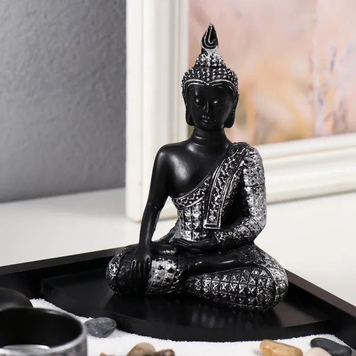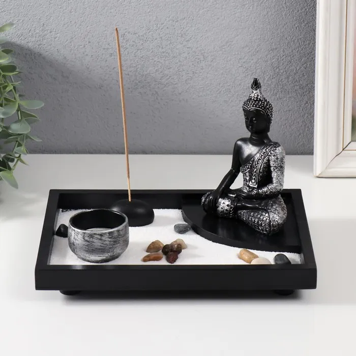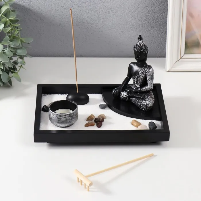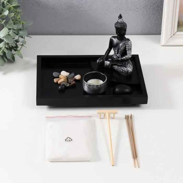 Создайте уголок гармонии на своём столе! Настольный сад камней с фигуркой Будды в серебристом одеянии — это миниатюрная композиция, которая привнесёт в ваше пространство атмосферу умиротворения и вдохновения. Чёрный цвет и лаконичный дизайн делают этот сад камней стильным акцентом в интерьере, а набор аксессуаров позволяет персонализировать композицию.