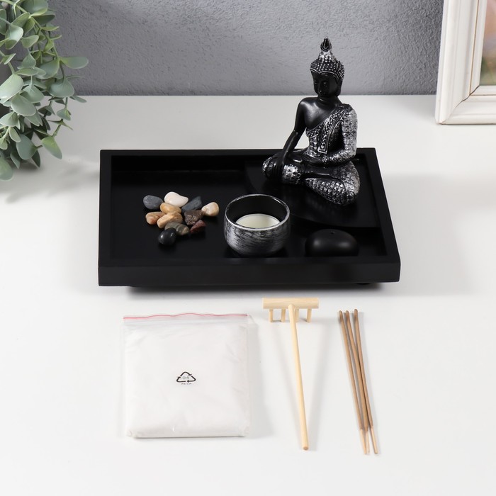 Японский сад камней настольный «Дзен. Будда в серебристом одеянии», с набором аксессуаров, 21.7×15.6×14.8 см — Характеристики