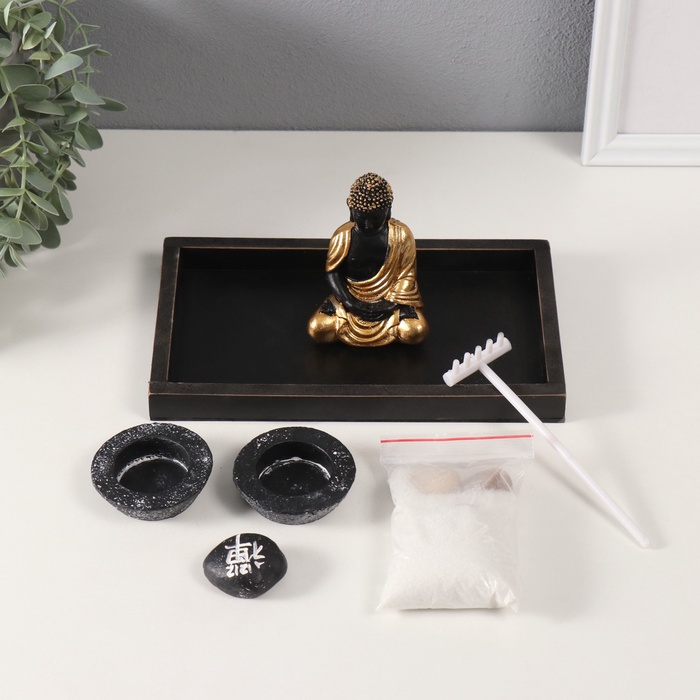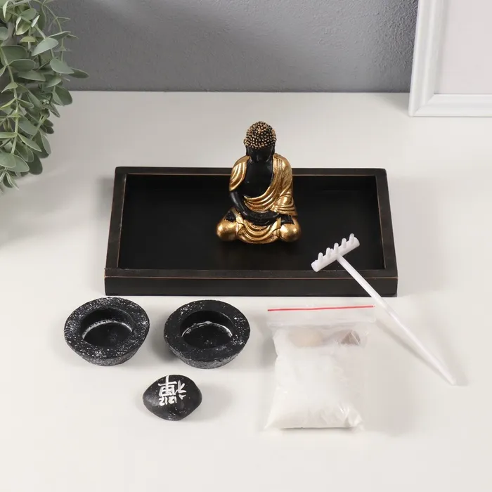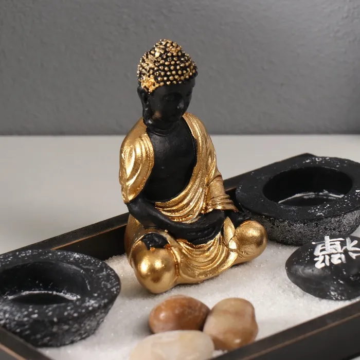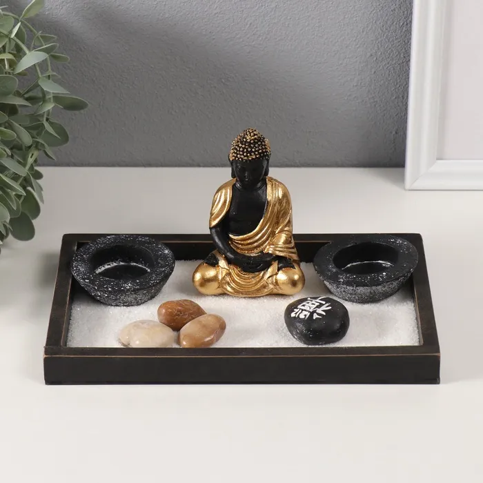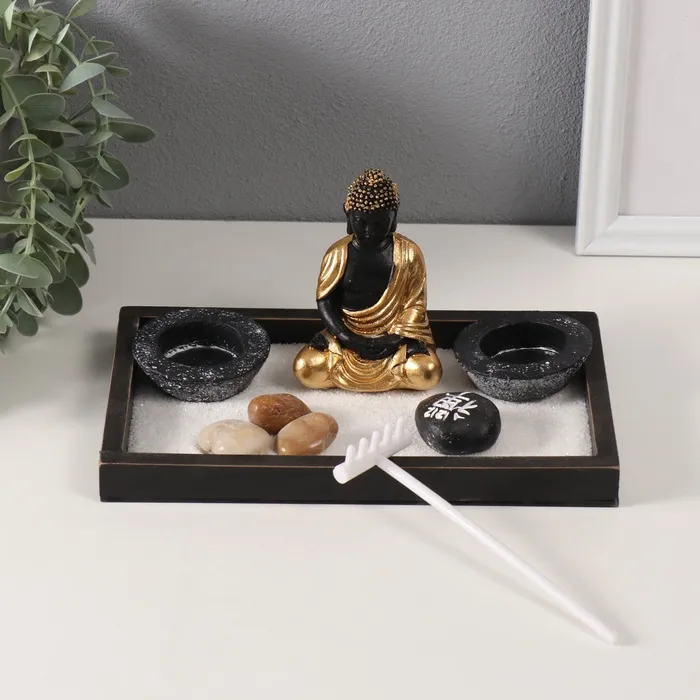 Настольный сад камней в стиле дзен с фигуркой Будды в золотой тоге — это миниатюрный оазис спокойствия, который станет стильным акцентом в вашем интерьере или на рабочем столе. Его лаконичный чёрный цвет и компактные размеры (22×13×10,2 см) подчеркивают элегантность и универсальность, позволяя гармонично вписаться в любое пространство.