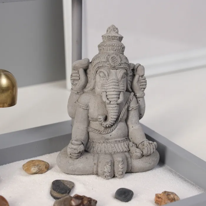 Сад включает в себя набор аксессуаров, таких как колокольчик, который добавляет медитативный звук в ваше пространство. Фигурка Ганеши, бога мудрости и удачи, символизирует защиту и процветание, усиливая положительную энергию в вашем доме или офисе. Работа с садом камней помогает снять стресс и развить чувство эстетики, погружая вас в мир красоты и гармонии. Этот сад станет не только стильным украшением, но и личным оазисом для медитации и релаксации.