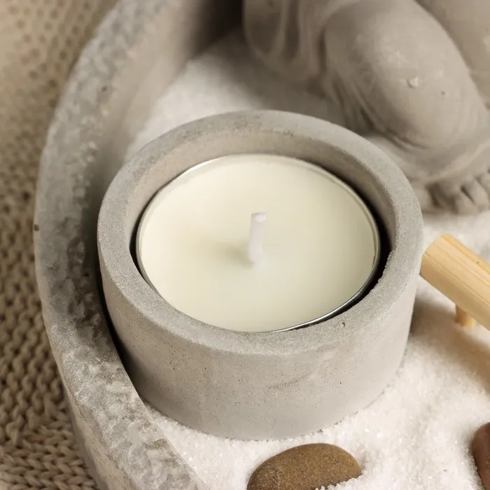 Комплект выполнен в сдержанных серых тонах, что подчеркивает его элегантность и универсальность. Размеры 17×17×8 см позволяют разместить его на рабочем столе, полке или в любом другом месте, где вы хотите создать атмосферу спокойствия. В набор входит свеча, которая добавляет уюта и создает мягкое освещение, усиливая медитативный эффект.