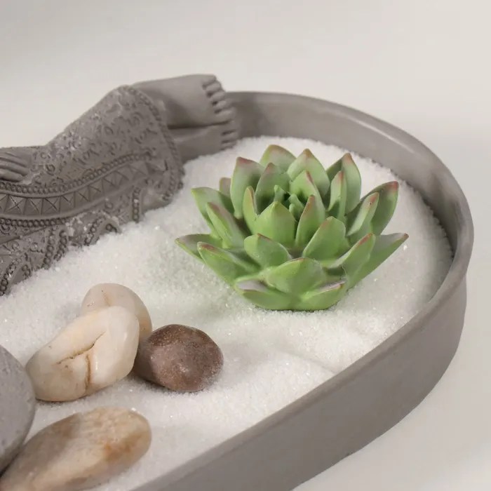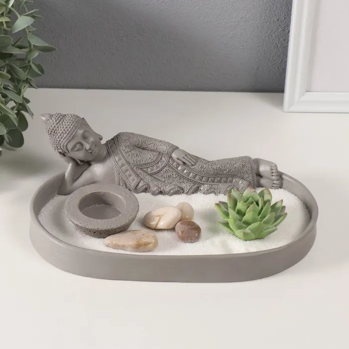 Погрузитесь в атмосферу спокойствия и гармонии с миниатюрным настольным садом в стиле Дзен. Эта композиция сочетает символы японской философии с изображением лежащего Будды, создавая пространство для медитации и размышлений.