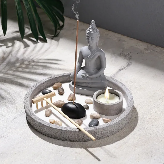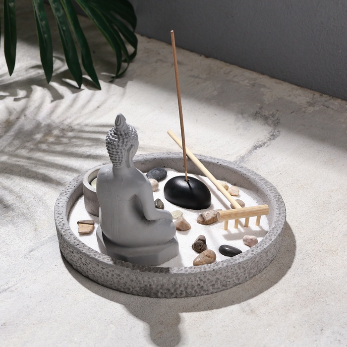 Японский сад камней настольный «Сад», с подставкой для благовоний, набор аксессуаров, 17.5×17.5×14 см, бетон