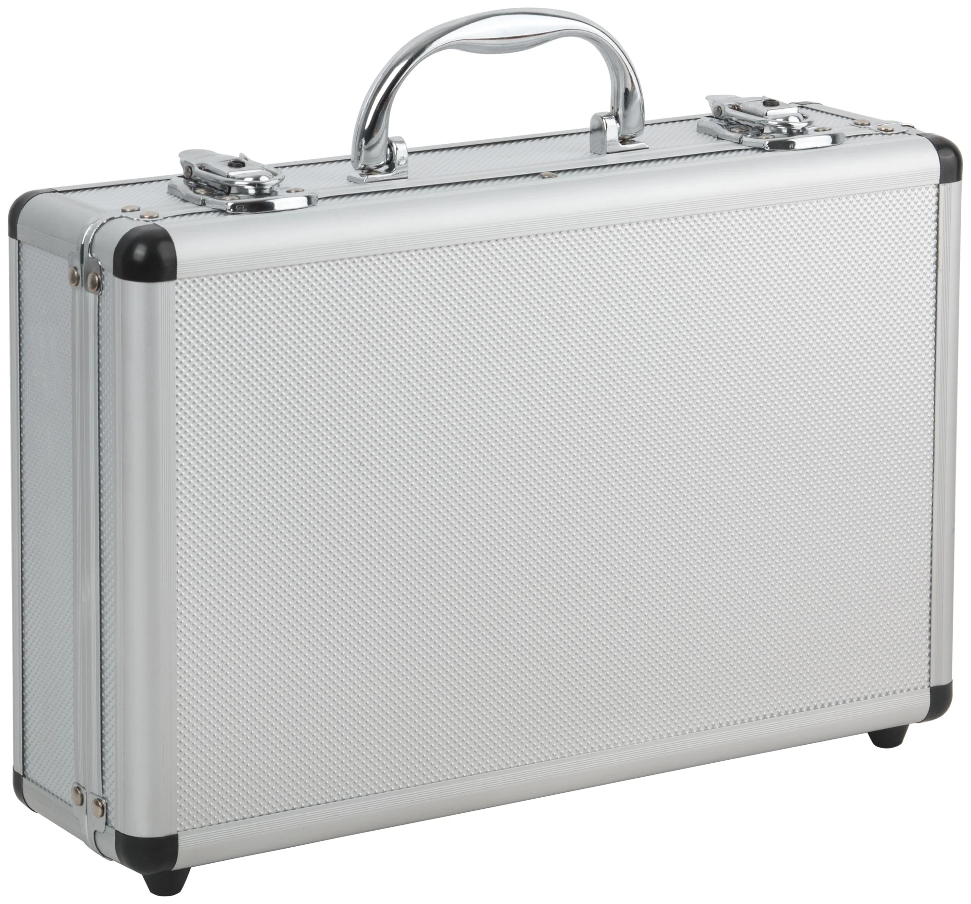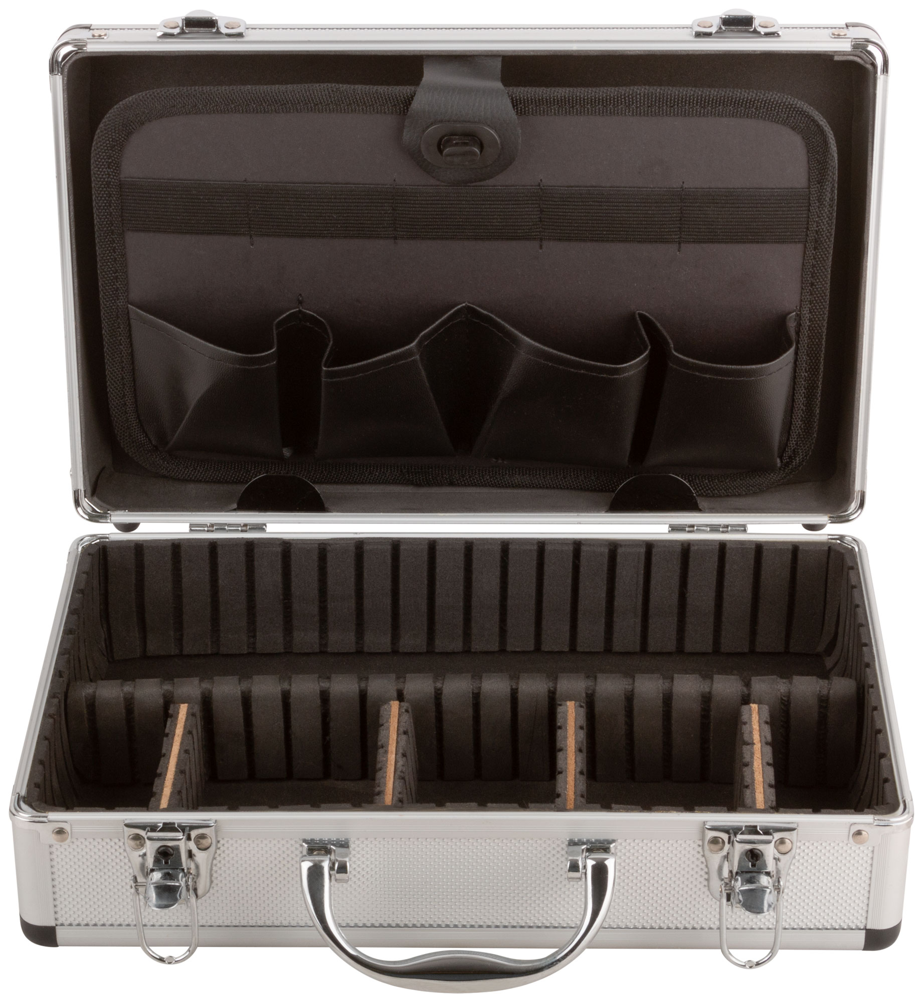 Ящик выполнен из прочного алюминия, что обеспечивает легкость и долговечность. Внутренняя отделка из мягкого пористого материала защитит инструменты от повреждений и царапин. Габариты 325x225x100 мм делают его удобным для транспортировки и размещения на полке.