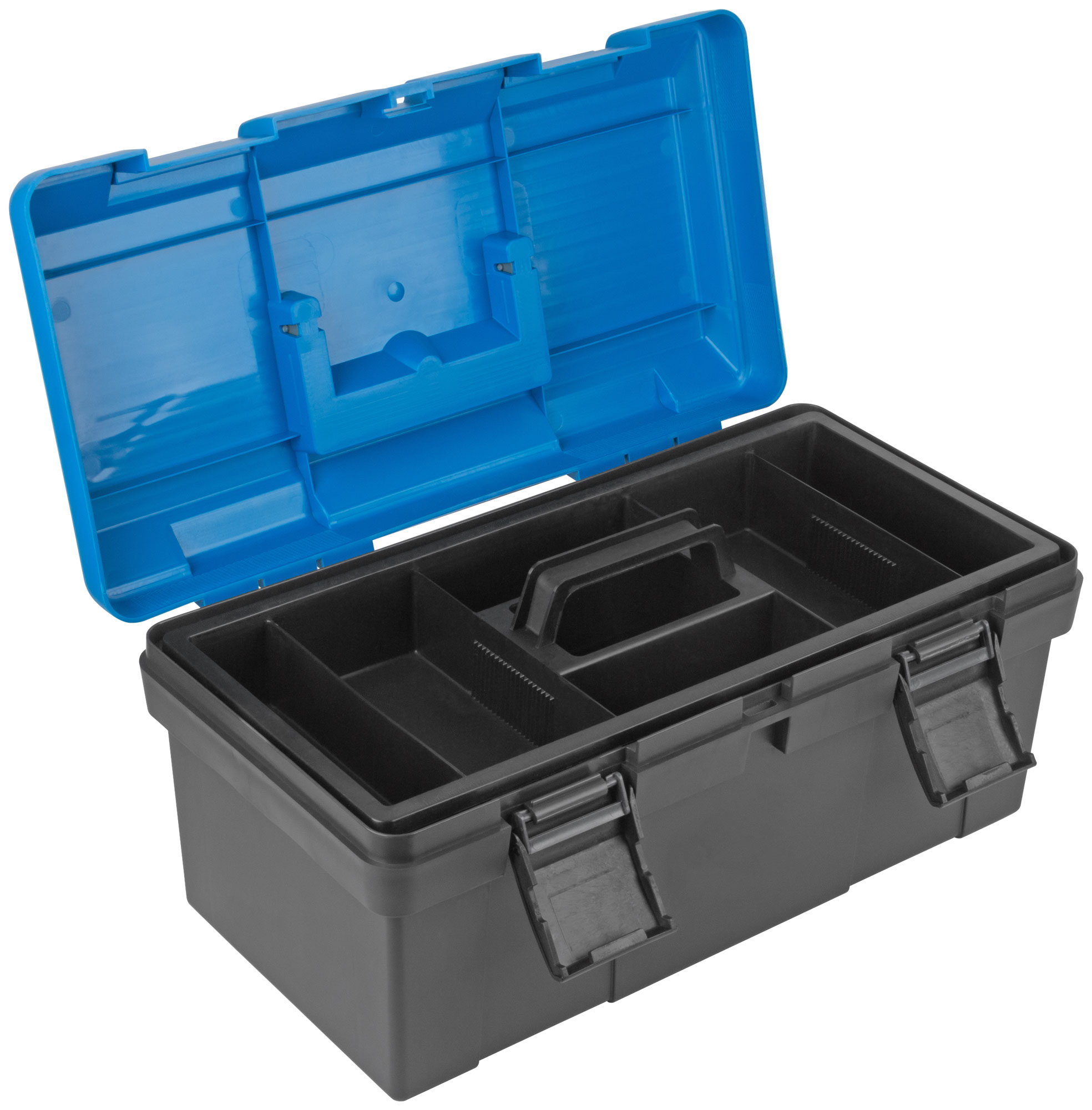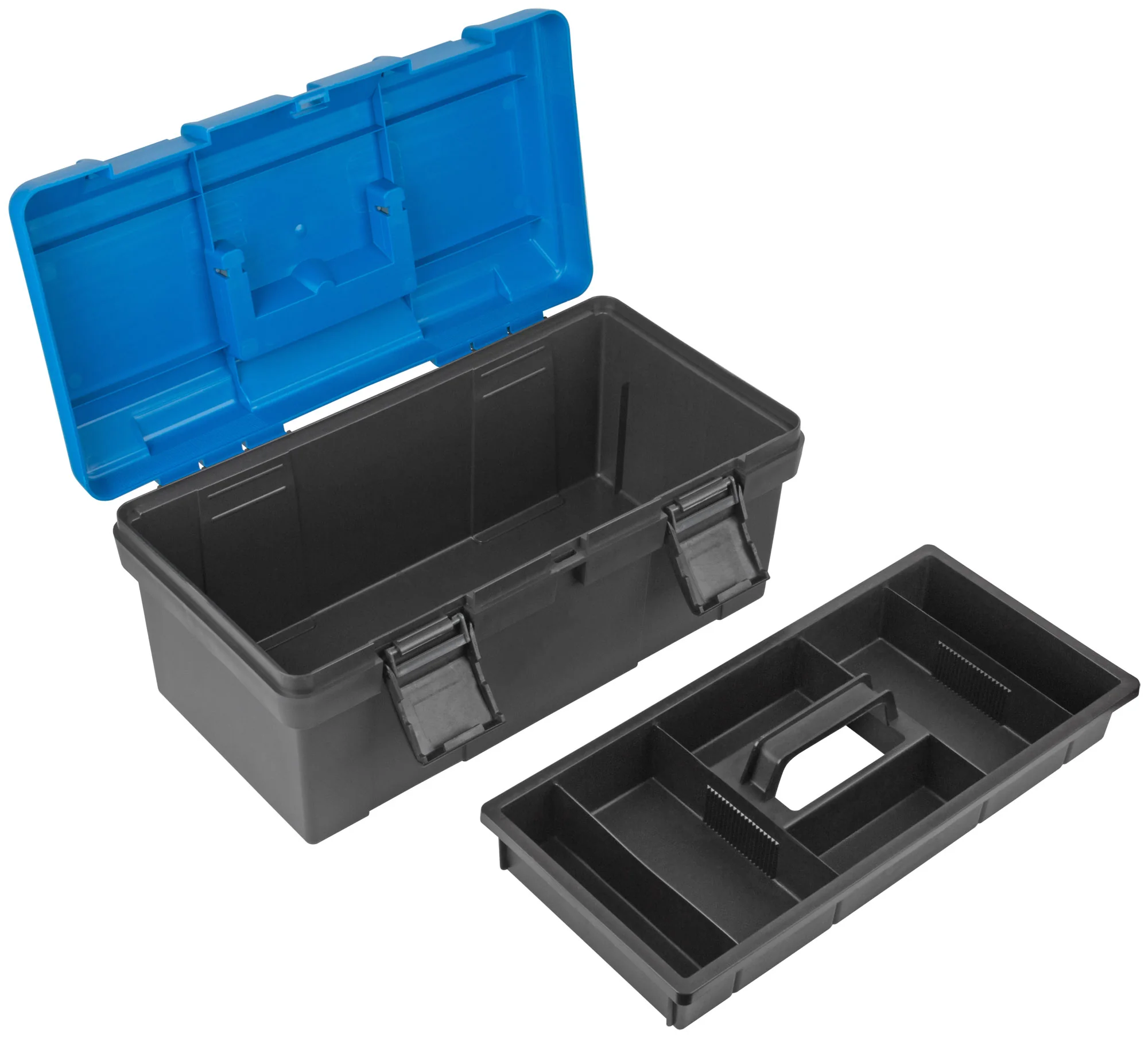Ящик изготовлен из прочного пластика, что обеспечивает длительный срок службы и защиту содержимого от внешних воздействий. Съемный лоток позволяет удобно организовать внутреннее пространство, а возможность установки навесного замка повышает безопасность хранения.