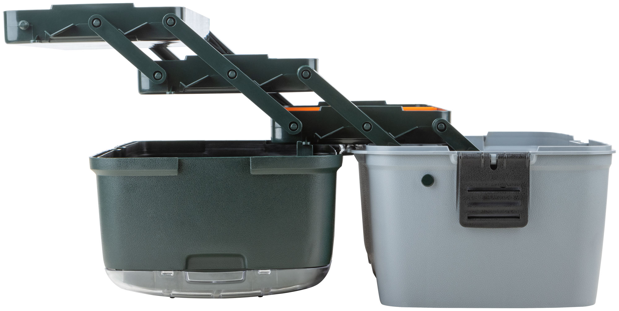 Ящик изготовлен из прочного пластика и оснащен раздвижным механизмом, который обеспечивает удобный доступ к двум органайзерам на крышке и трем внутренним секциям. Размеры 450 x 210 x 250 мм позволяют компактно разместить его в автомобиле или на рабочем месте.