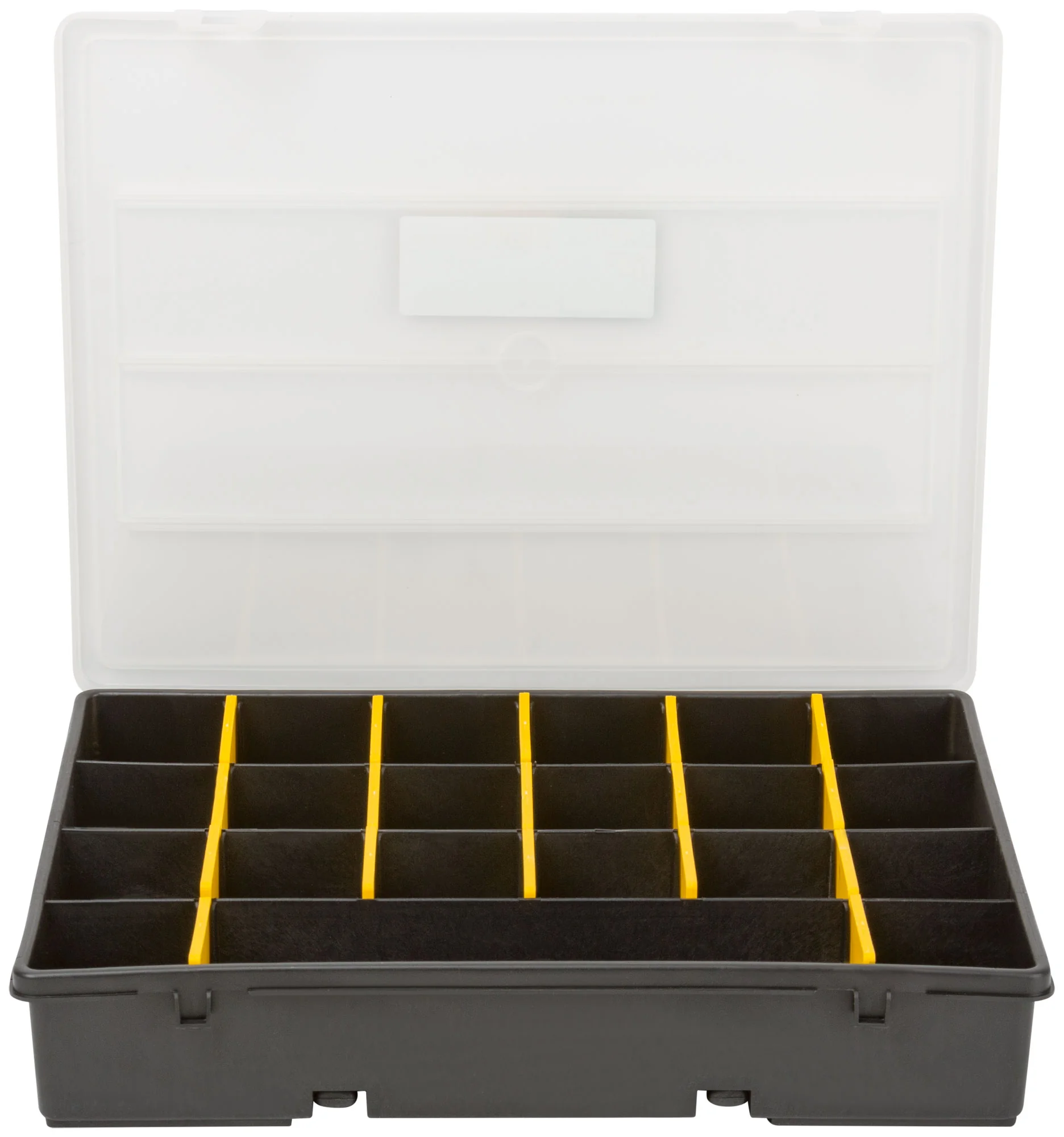 Ящик изготовлен из прочного пластика и оснащен переставными перегородками, что позволяет изменить внутреннее пространство под ваши нужды. С 21 отделением вы легко сможете разместить как мелкие, так и крупные крепежные элементы.