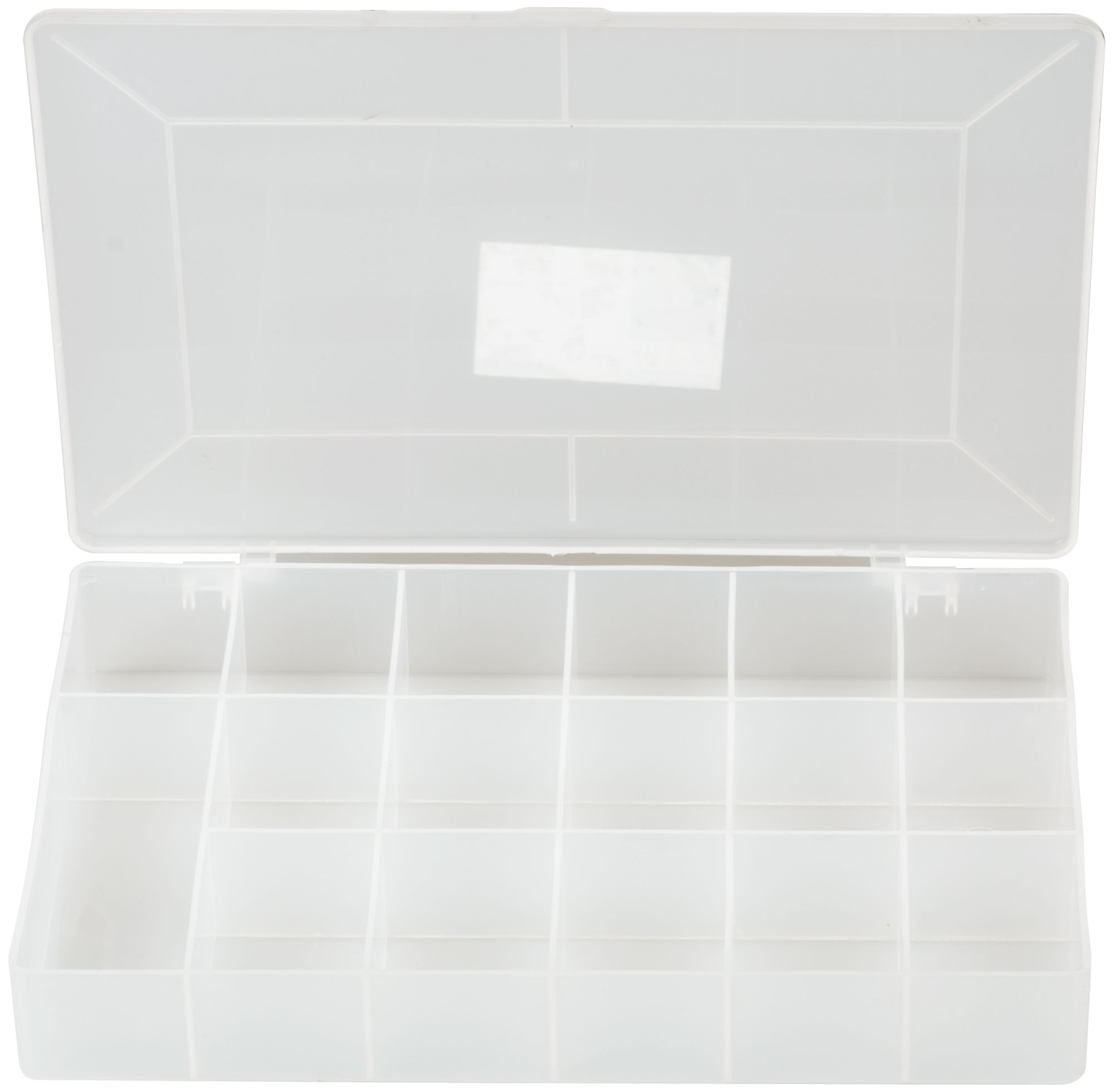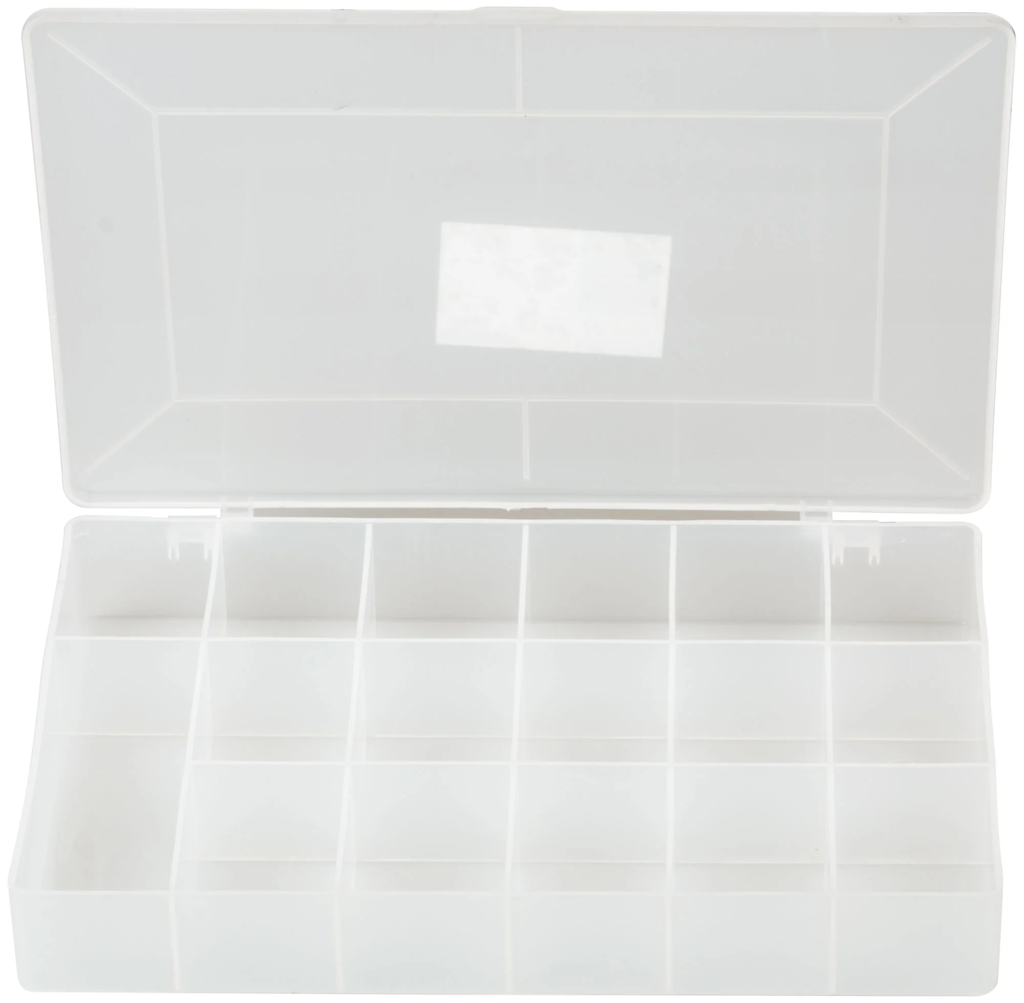 Ящик выполнен из прочного пластика и оснащен 17 отделениями, которые позволяют эффективно организовать пространство под различные типы крепежа. Прозрачный корпус обеспечивает быстрый обзор содержимого без необходимости открывать крышку.