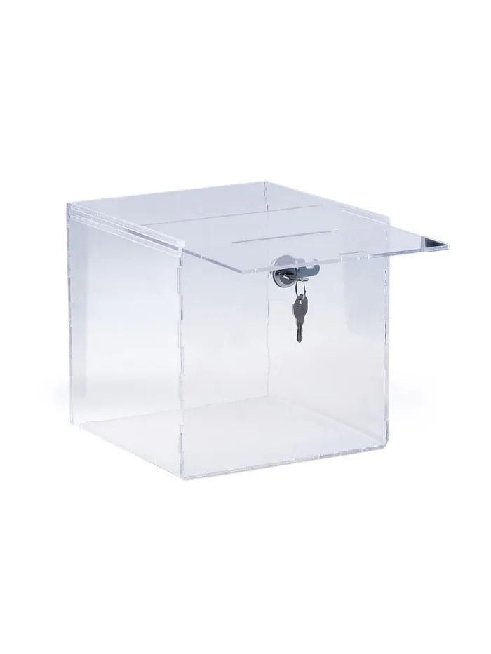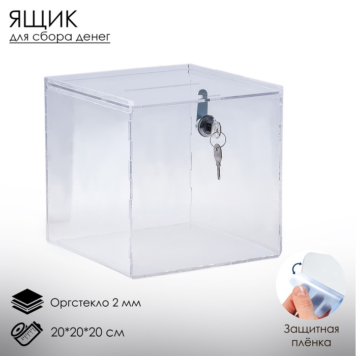Ящик для сбора денег с врезным замком обеспечивает безопасность и стильный внешний вид. Размеры 20×20×20 см делают его компактным и удобным для использования. Прозрачное оргстекло позволяет видеть содержимое. Подставки из оргстекла (листовой акрил). Благодаря использованию 100% акрила, подставки имеют идеальную прозрачность, высочайший блеск и шикарный внешний вид. ВНИМАНИЕ: Изделия поставляются в матовой защитной плёнке, белого, синего, зелёного или прозрачного цвета, которую необходимо удалить перед оценкой качества или перед использованием.
