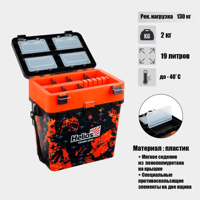 Ящик Helios FishBox изготовлен из ударопрочного морозостойкого пластика, который не пропускает воду, не впитывает запахи и не подвержен деформации. Материал легко отмывается от любых загрязнений, например от глины и рыбьей слизи. В навесных карманах можно разместить багорик, черпак и удочки.