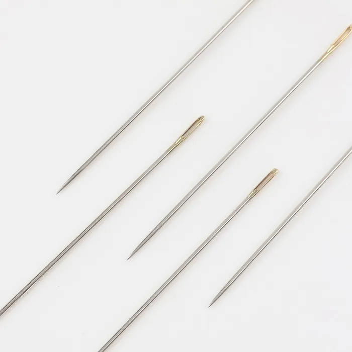 Позолоченное ушко значительно упрощает вдевание: оно идеально гладкое и не цепляет материал. В процессе шитья уменьшается нагрузка на нить, она меньше истирается. Остриё легко прокалывает полотно и позволяет проложить ровные стежки.