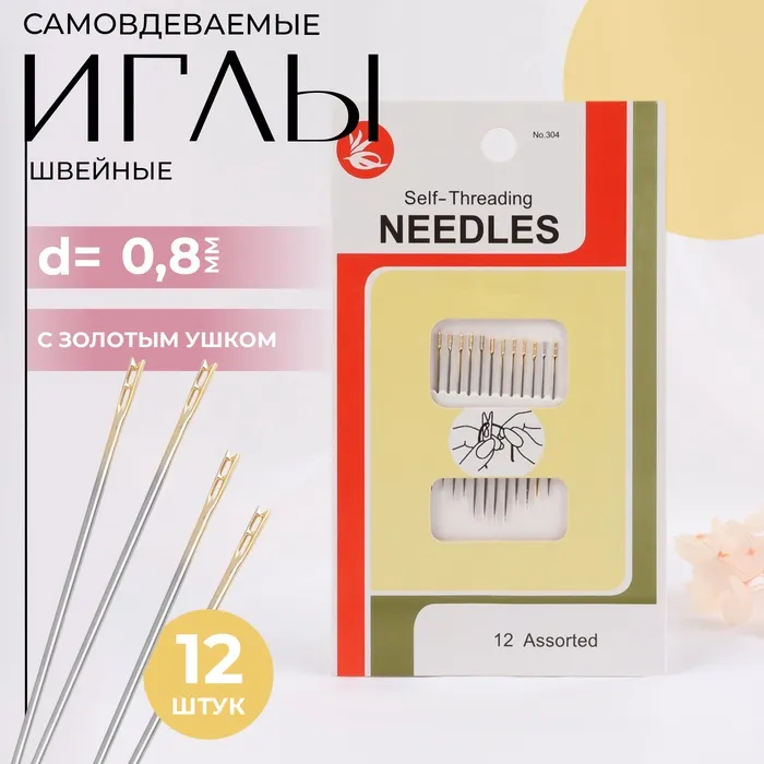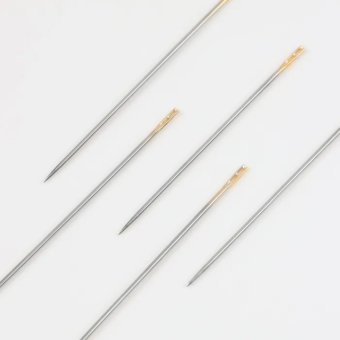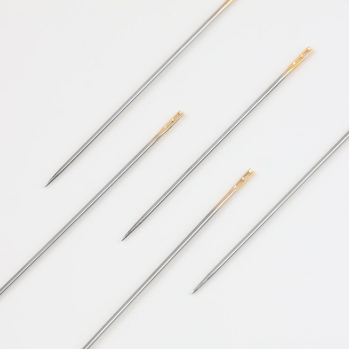 Позолоченное ушко значительно упрощает вдевание: оно идеально гладкое и не цепляет материал. В процессе шитья уменьшается нагрузка на нить, она меньше истирается. Остриё легко прокалывает полотно и позволяет проложить ровные стежки.