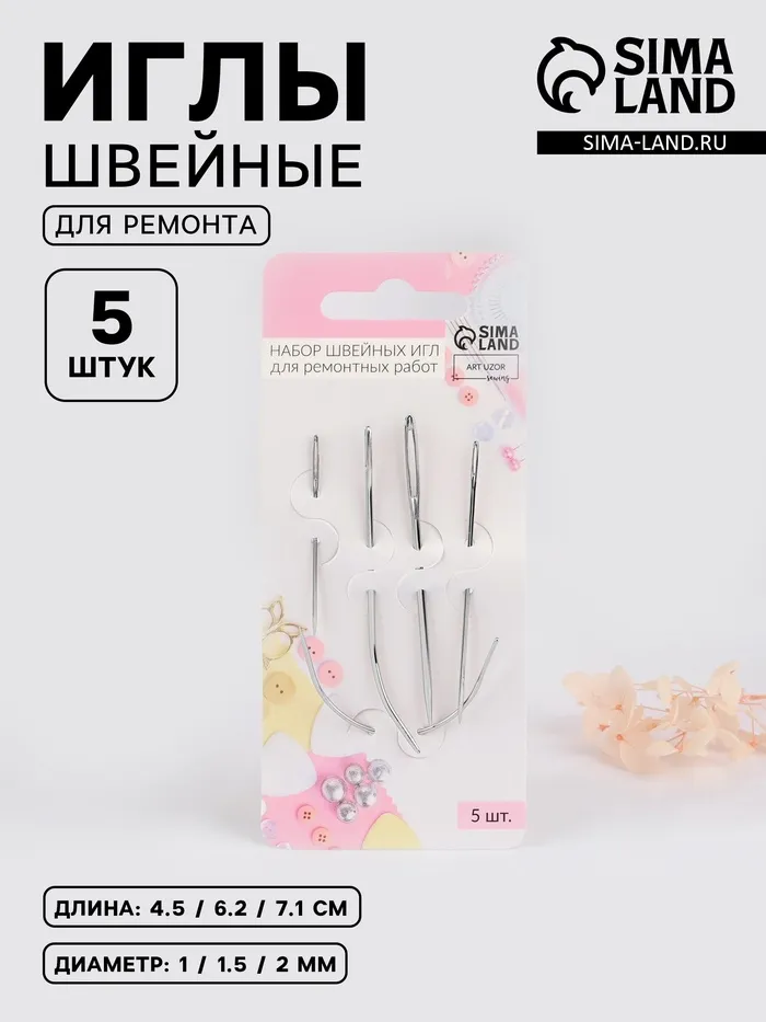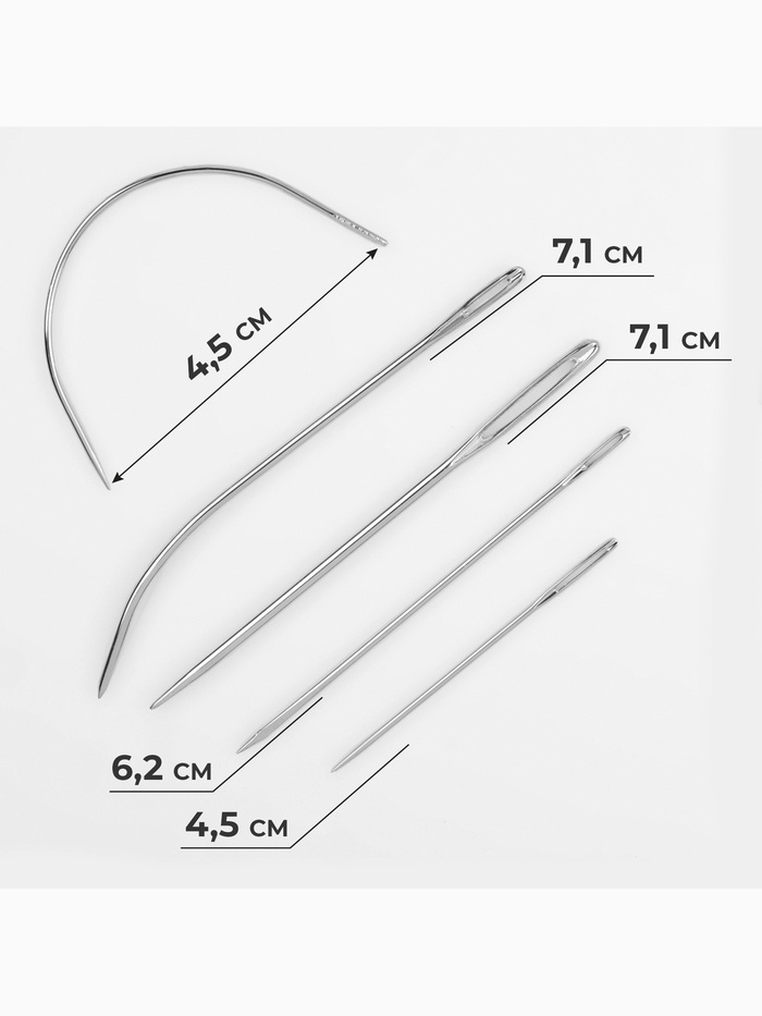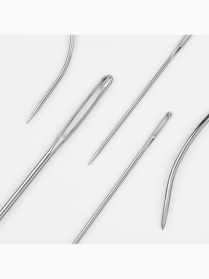 Данные иглы предназначены для разных типов ткани и различных техник шитья и ремонта. Изогнутые иглы изготовлены спициально для работы с подушками, матрацами, обивкой, абажурами и многим другим; прямые — для книжных переплётов, шитья парусины, работы с гобеленом, коврами и тому подобным.