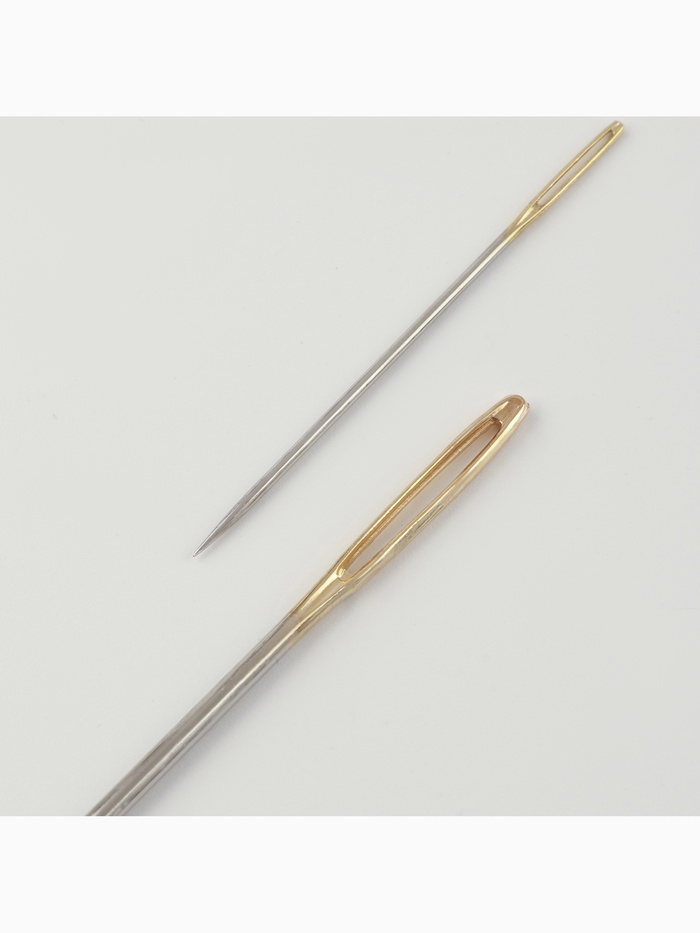 Позолоченное ушко значительно упрощает вдевание: оно идеально гладкое и не цепляет материал. В процессе шитья уменьшается нагрузка на нить, она меньше истирается. Остриё легко прокалывает полотно и позволяет проложить ровные стежки.