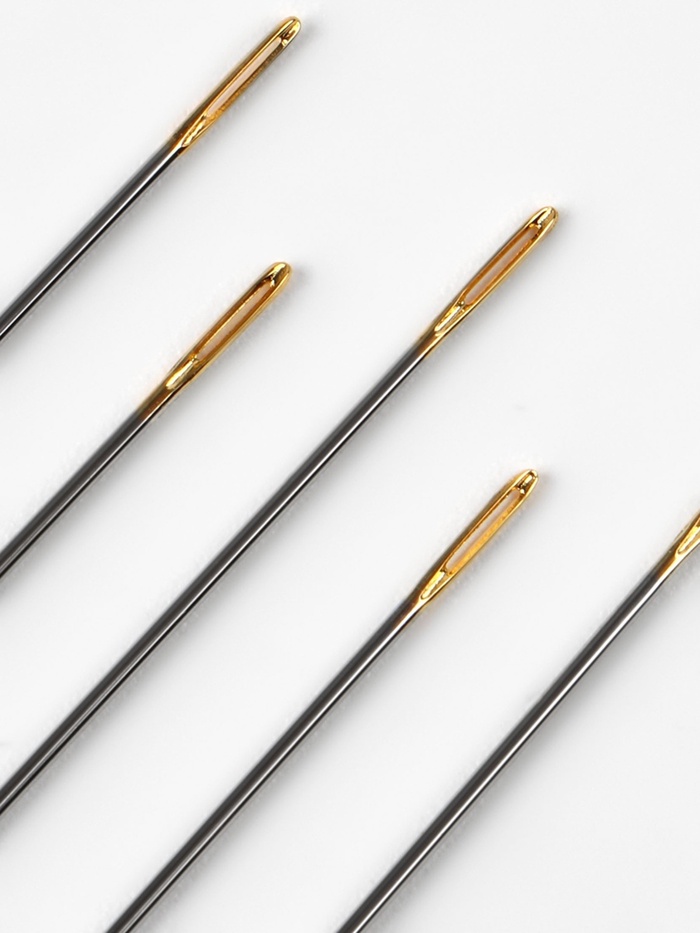 - Золотое ушко — не только красиво, но и практично: оно снижает трение нити при прохождении через отверстие, что уменьшает риск обрыва и делает старт шитья быстрее. Такие иглы удобнее использовать в условиях недостаточного освещения или при плохом зрении.