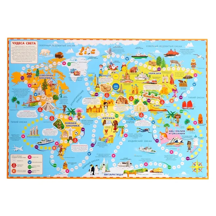Настольная игра-ходилка «Чудеса света» — это захватывающая игра-путешествие по всем материкам Земли. Во время путешествия откроются удивительные места в самых разных уголках нашей планеты. Необходимо пройти весь игровой путь и познакомиться с новыми чудесами света, которые были выбраны голосованием во многих странах мира.