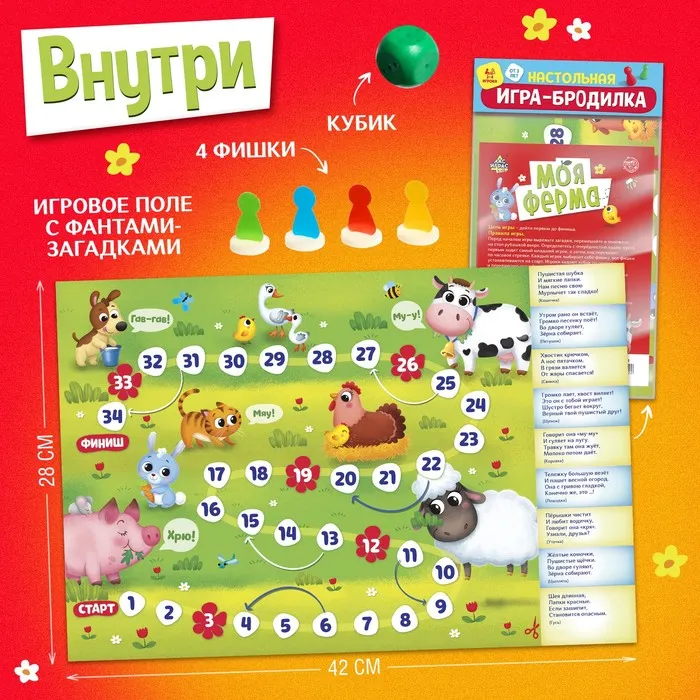 Игра-бродилка «Моя ферма» рассчитана на дружную компанию от 2 до 4 человек. Рассказывайте малышу о животных, играйте в игру и познавайте мир вместе с нами!