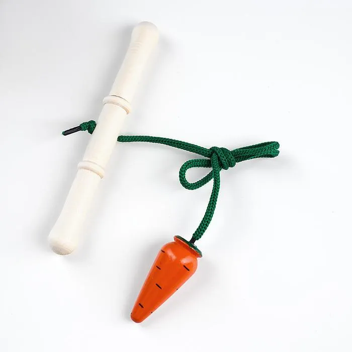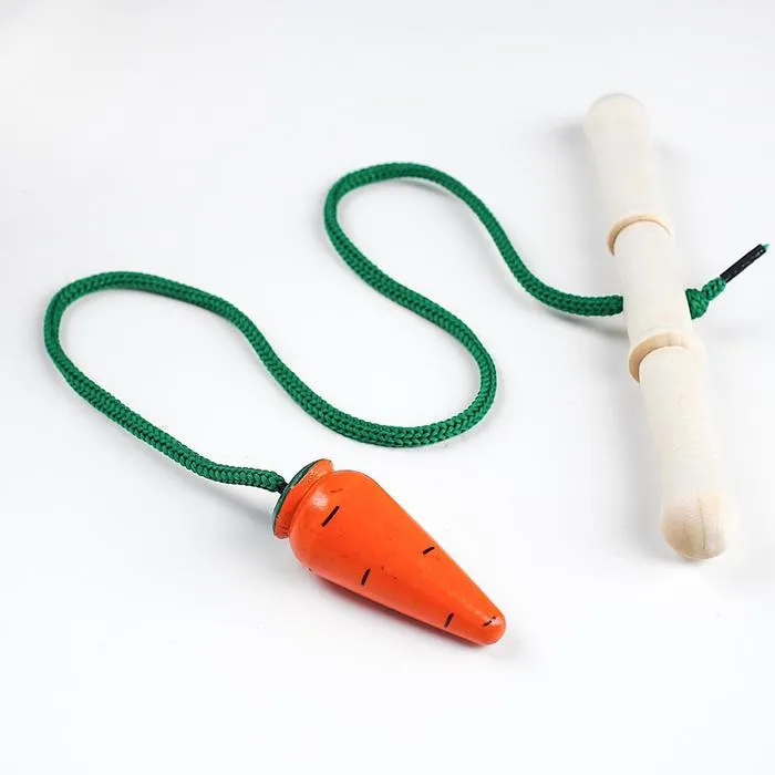 Игра «Достань морковку» поможет освоить навык наматывания, который отлично тренирует ловкость рук и мелкую моторику. Также можно добавить игре дух соревнования: предложите детям накручивть шнурок на палочку по очереди, засекая при этом время или считая вслух. Проверьте, кто быстрей справится с задачей и достанет морковку для зайчика.