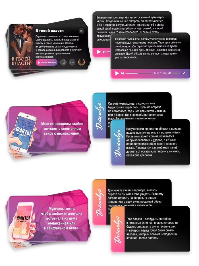 - 60 карт с заданиями: поцелуй, секс-поза, задание для неё, задание для него, вопрос.