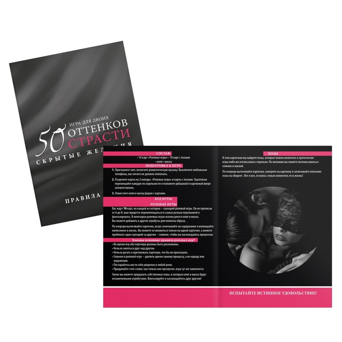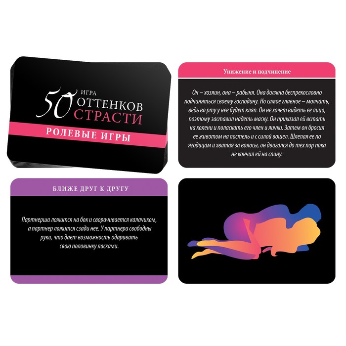 В комплекте вас ждёт 10 карточек, на каждой из которых в общих чертах прописан сценарий ролевой игры. Вам предстоит перевоплощаться в самых разных персонажей и фантазировать. В некоторых ролевых играх используются кляп и маска. Для полноты образа вы можете добавить и другие атрибуты. По очереди вытягивайте карточки, вслух зачитывайте содержание и воплощайте написанное в жизнь. Вы можете остановиться на одной карточке, а можете пробовать несколько сценариев — главное, чтобы вы наслаждались процессом.