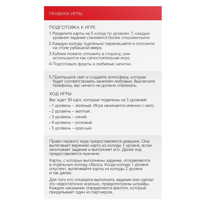 Игра включает в себя 53 карточки с заданиями разных уровней сложности. Каждому соответствует свой цвет: первому — зелёный, второму — жёлтый, третьему — голубой, четвёртому — розовый, пятому — красный.