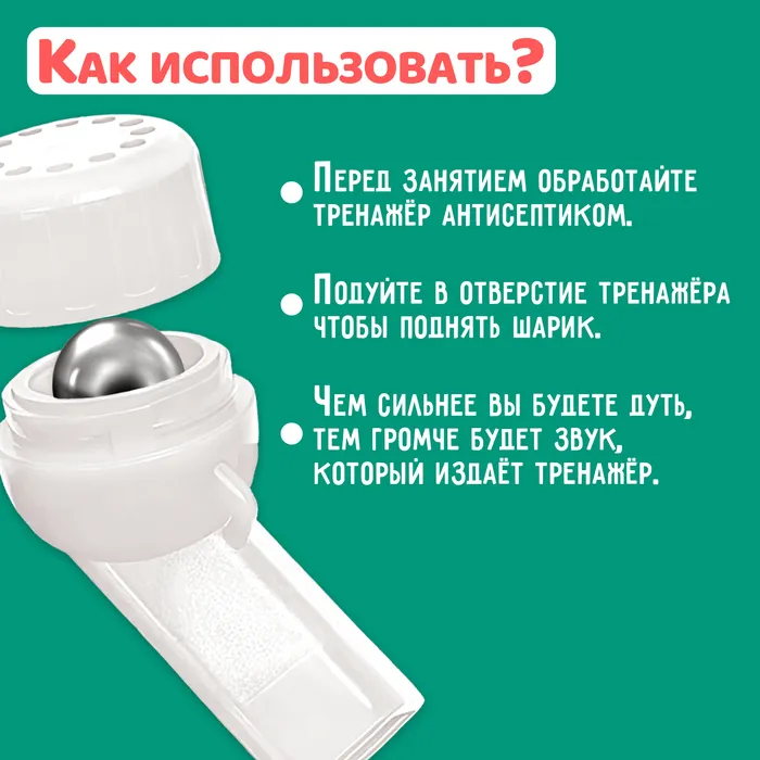 - Подуйте в отверстие тренажёра чтобы поднять шарик.