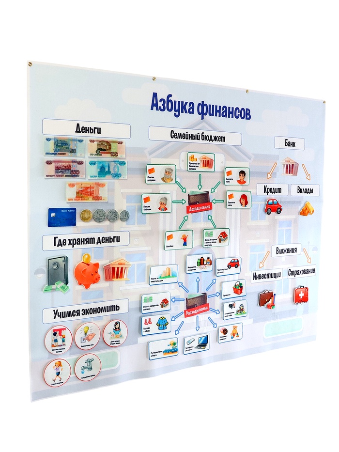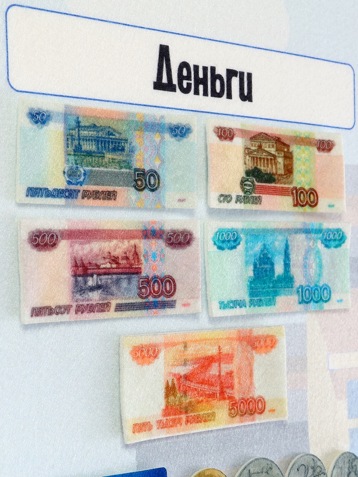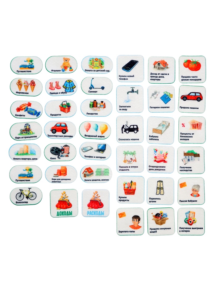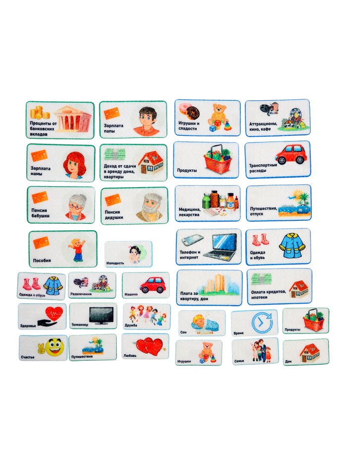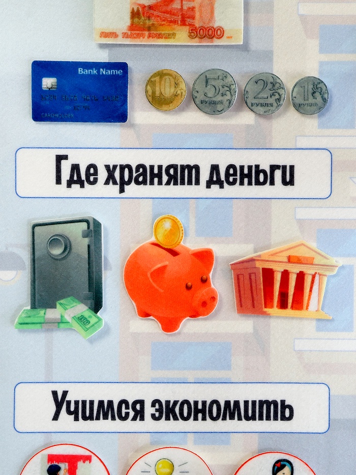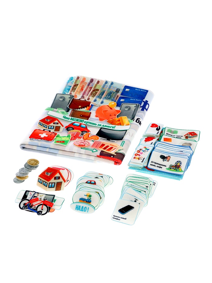- Фигурки на липучках — 139 шт. (элементы: «Деньги», «Где хранят деньги», «Учимся экономить», «Семейный бюджет», «Банк», «Вложения»)