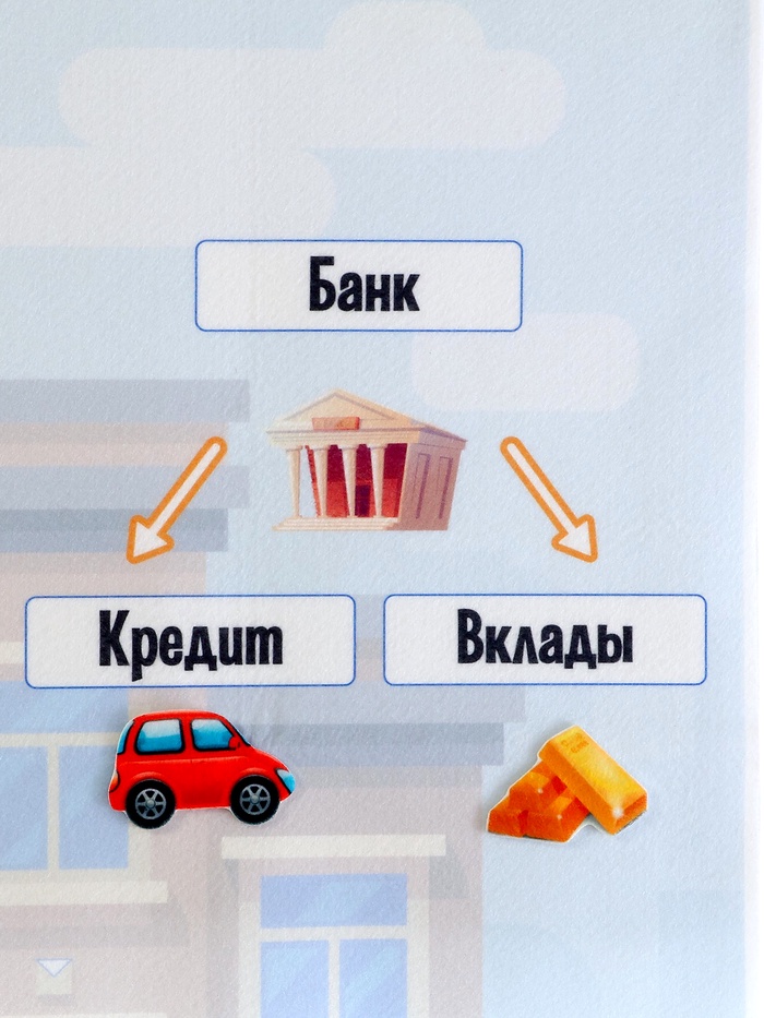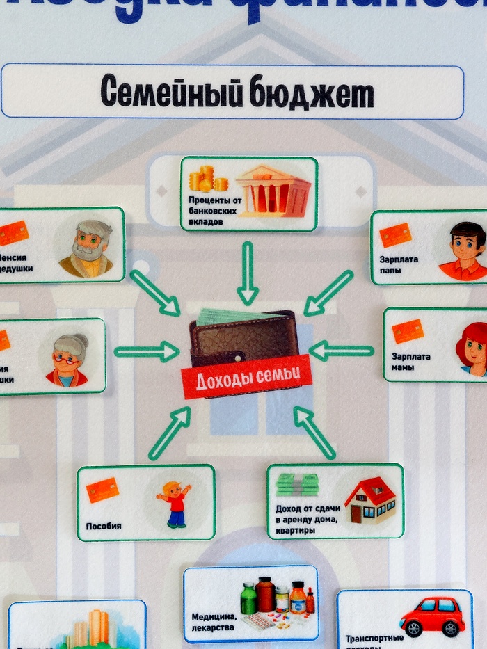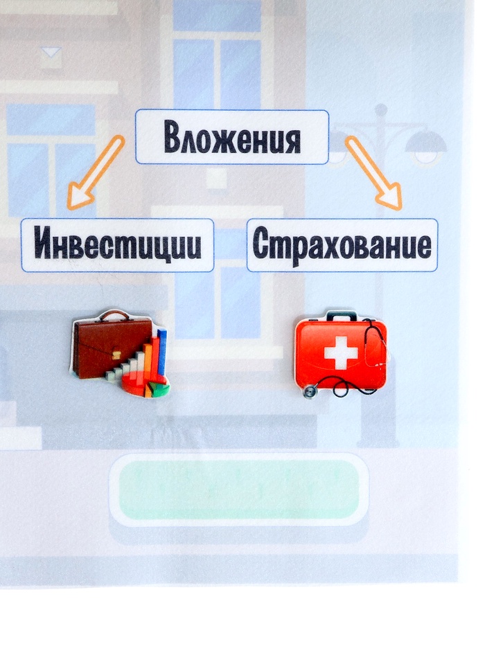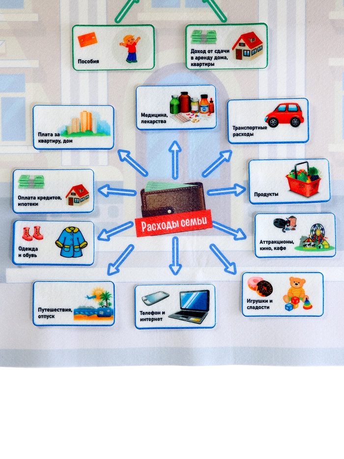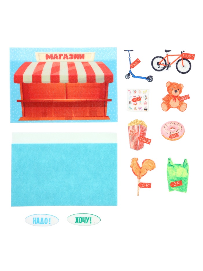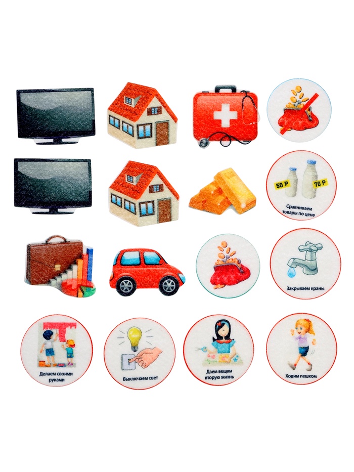 - Фигурки на липучках — 139 шт. (элементы: «Деньги», «Где хранят деньги», «Учимся экономить», «Семейный бюджет», «Банк», «Вложения»)