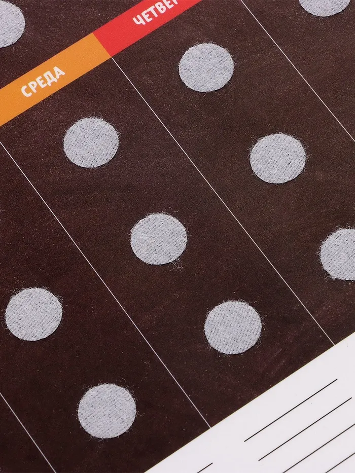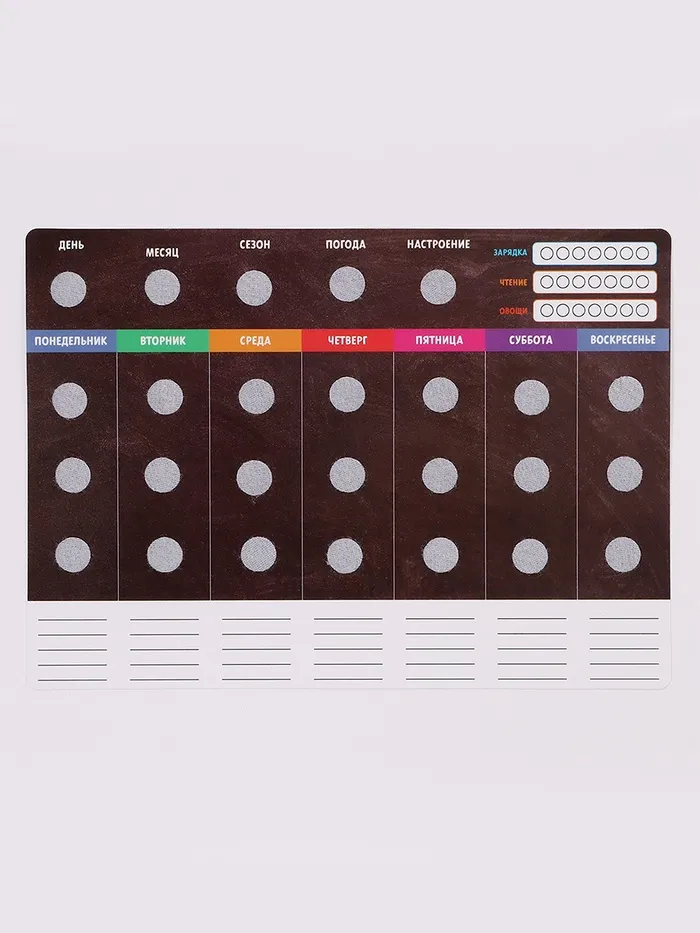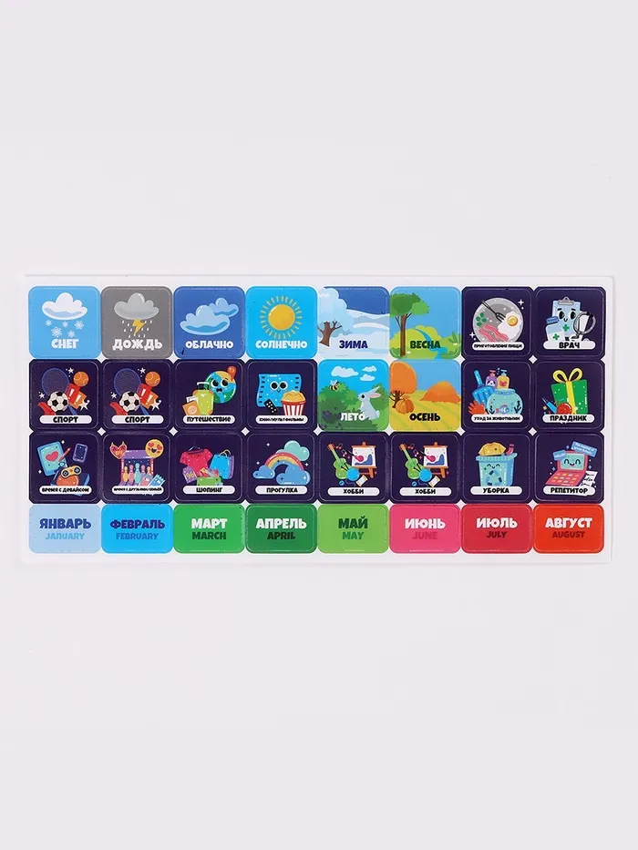 Игрушка на липучках — это развивающая игра, созданная специально для малышей. Набор включает в себя основу с полями и 69 деталей, которые помогут ребёнку планировать свои дни.