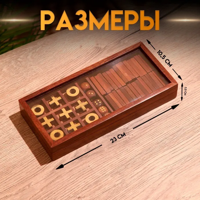 Игра настольная 3 в 1, домино, крестики-нолики, кубики, 23×10.5×3.5 см, дерево шишам — Характеристики