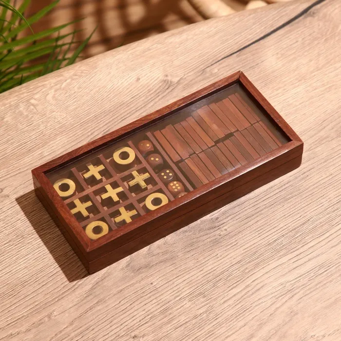 Игра настольная 3 в 1, домино, крестики-нолики, кубики, 23×10.5×3.5 см, дерево шишам