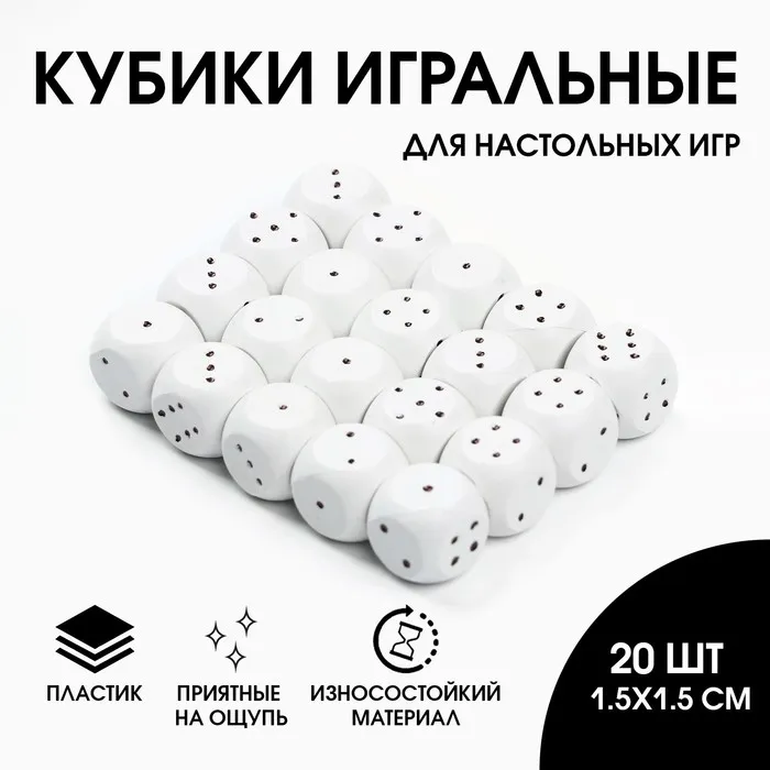 Кости игральные, кубики для настольных игр, 1.5 х 1.5 см, набор 20 шт, белые
