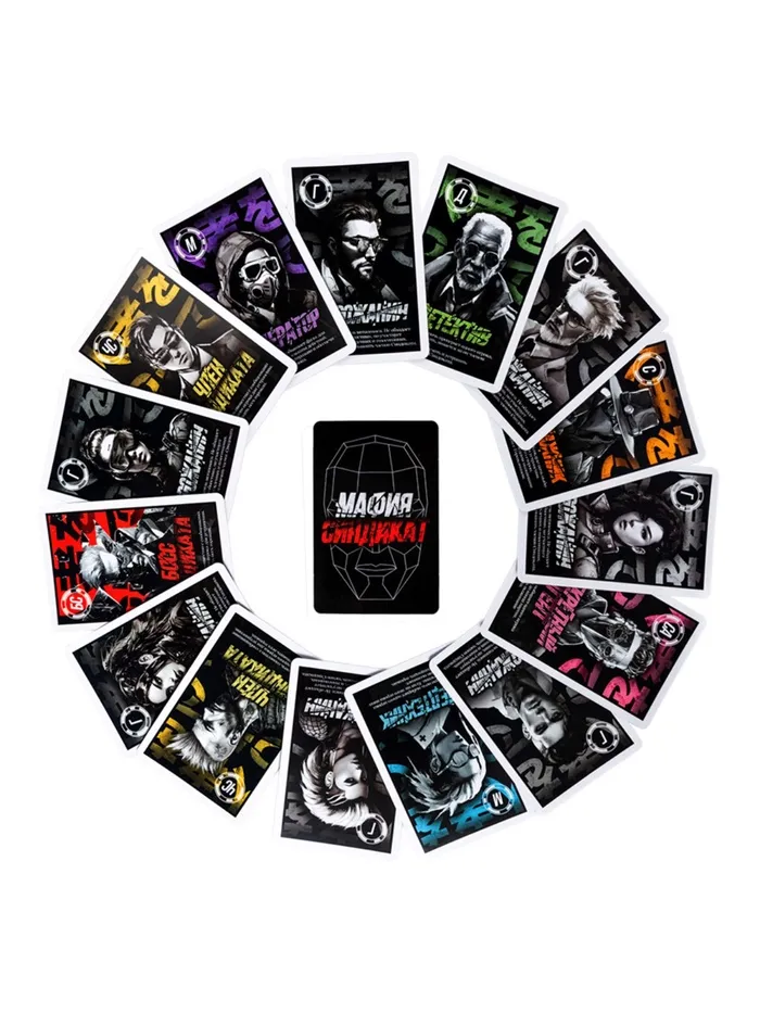 Настольная игра «Мафия. Синдикат» — это профессиональный набор, который включает в себя красочные карты с ролями и 10 масок, создающих дополнительный колорит и атмосферу.