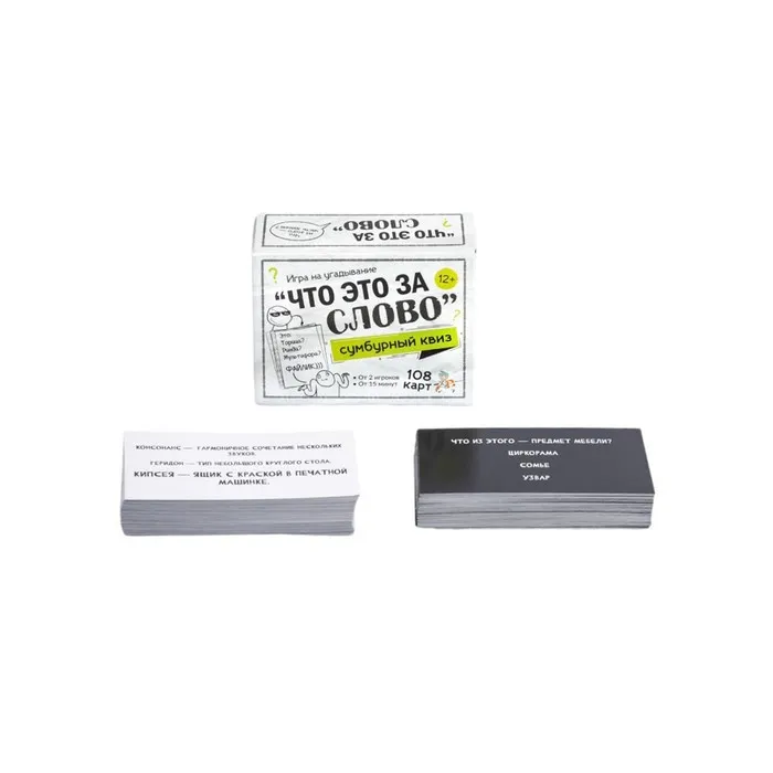 Проверь свою эрудицию и умение мыслить нестандартно! «Сумбурный квиз. Что это за слово» — интеллектуальная игра для компаний, где нужно угадывать значения редких, забавных и просто неожиданных слов. Колода из 108 карточек с вопросами превратит любой вечер в турнир знатоков языка.