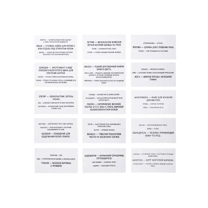 Игрок зачитывает слово и три возможных толкования — только одно из них верное. Угадал определение? Карта твоя! Ошибся — карта уходит в сброс. Побеждает тот, кто соберет больше всего карточек к концу колоды.