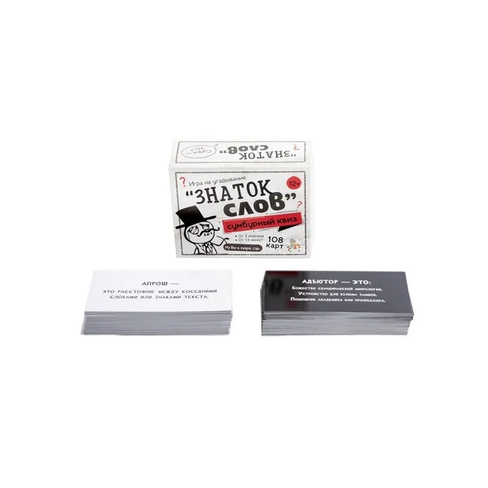 Проверь свою эрудицию и умение мыслить нестандартно! «Сумбурный квиз. Знаток слов» — интеллектуальная игра для компаний, где нужно угадывать значения редких, забавных и просто неожиданных слов. Колода из 108 карточек с вопросами превратит любой вечер в турнир знатоков языка.