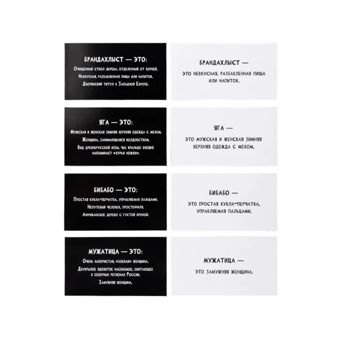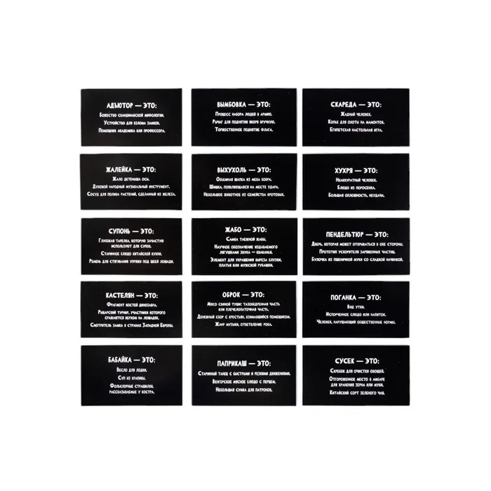 Игрок зачитывает слово и три возможных толкования — только одно из них верное. Угадал определение? Карта твоя! Ошибся — карта уходит в сброс. Побеждает тот, кто соберет больше всего карточек к концу колоды.