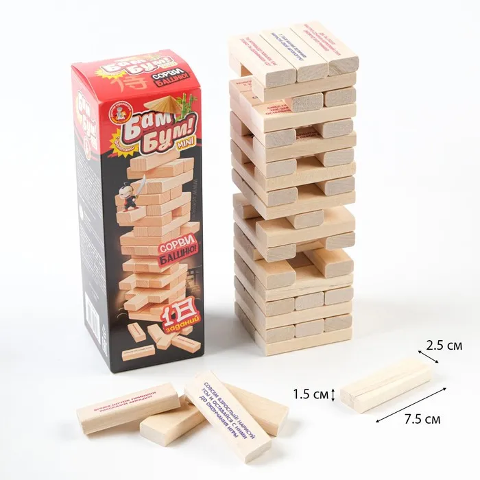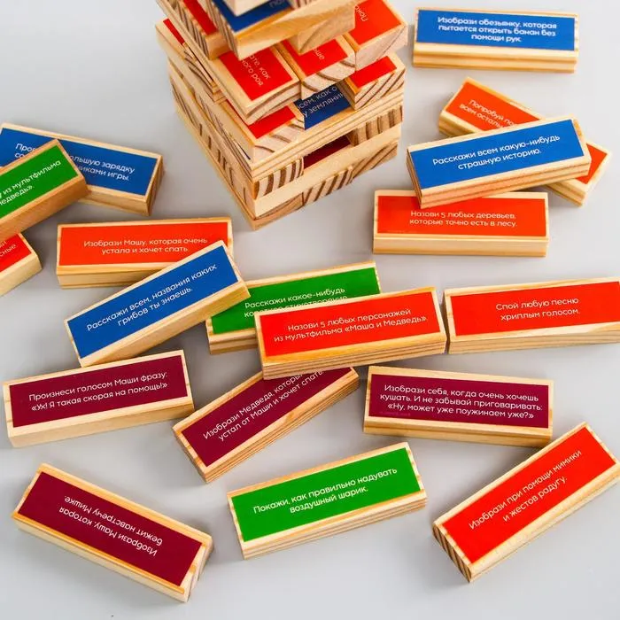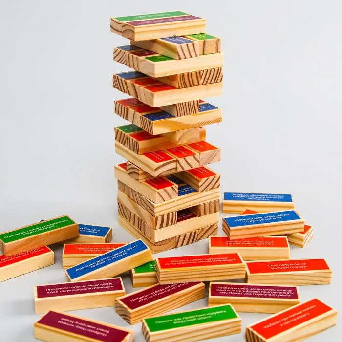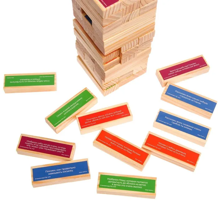 Постройте башню из брусков и-и-и… вытягивайте по одной штучке из башни так, чтобы последняя не упала. На каждом элементе вы найдёте слова и приклеенные вами картинки. Именно они подскажут, какими способами нужно объяснять слова с брусков.