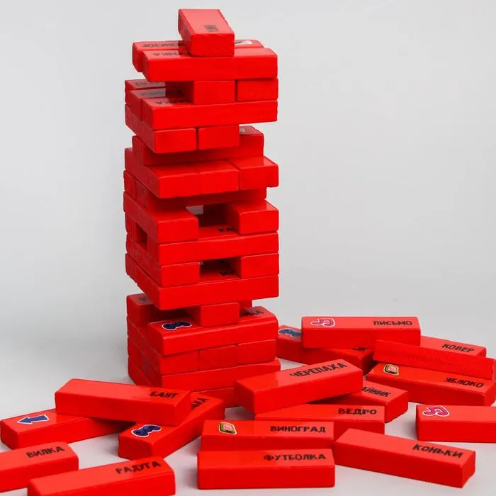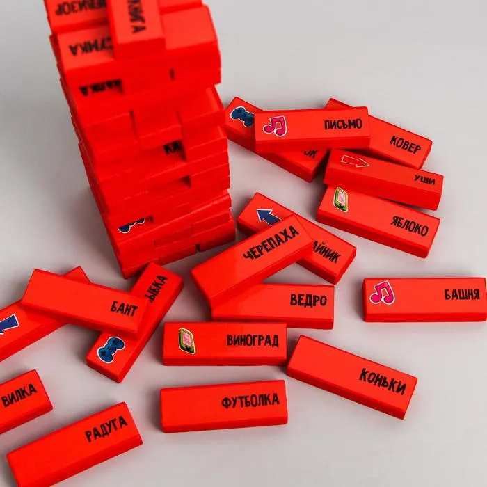 Постройте башню из брусков и-и-и… вытягивайте по одной штучке из башни так, чтобы последняя не упала. На каждом элементе вы найдёте слова и приклеенные вами картинки. Именно они подскажут, какими способами нужно объяснять слова с брусков.