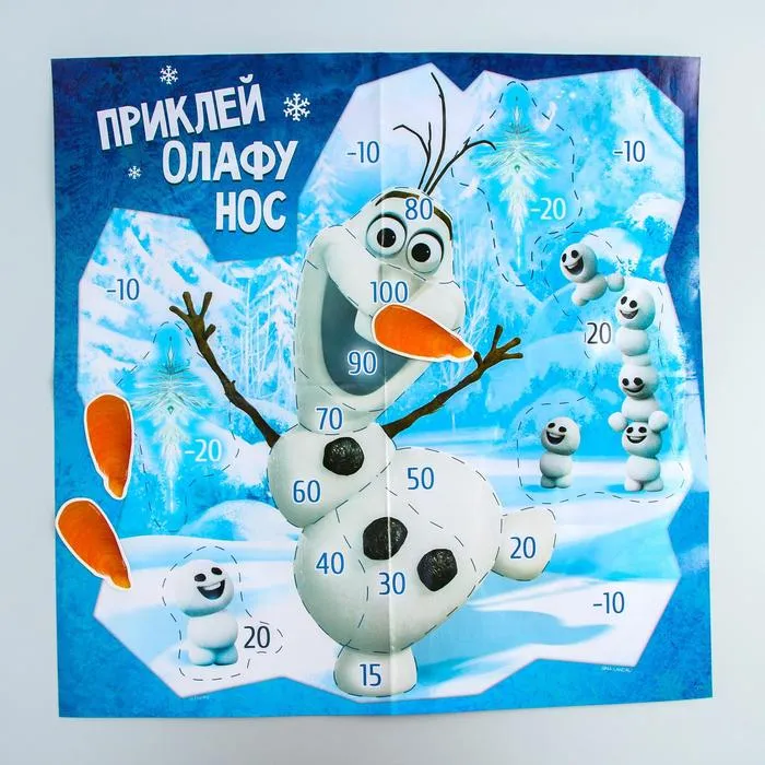 Добро пожаловать в королевство Эренделл! Познакомьтесь с его самым забавным жителем — снеговиком Олафом. С ним постоянно что-нибудь да приключается. Например, сегодня он угодил в сугроб и потерял свой нос-морковку. Скорее помогите ему! Закройте глаза и попробуйте прилепить морковку в нужное место. Победу одержит самый точный игрок!